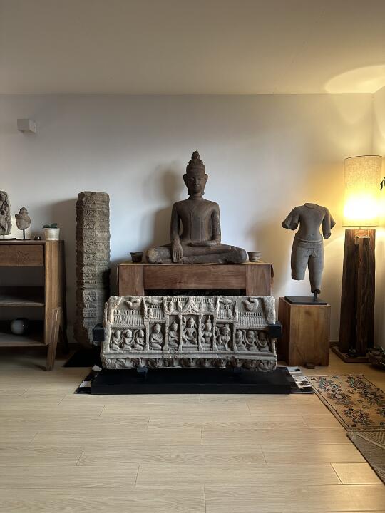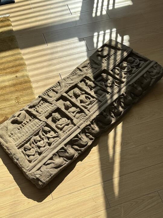 高棉11-12世纪 Baphuon艺术风格 Prachin buri (泰国巴真武里地区 原高棉帝国领土)寺庙风格Ramayana罗摩衍那 浮雕门楣 内容主要讲述阿逾陀国王子罗摩多在神猴Hanuman的帮助下与猴王结盟,成功解救了他的妻子悉多后的场景。许多小猴子手持扇子在大殿两侧,正中心手持莲花的就是罗摩,他的右边是妻子和侍女,左边则是他的两个儿子。大殿底下刻画的是成群的天鹅,大殿的顶部有四只神鸟。