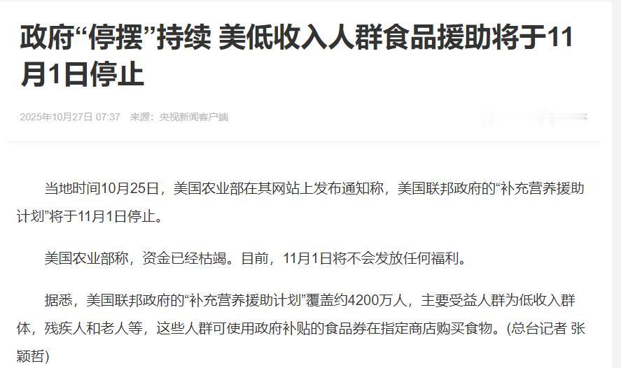 美国农业部突然宣布了!   10月26日,美国农业部正式宣布,由于联邦政府持续关门,主要食品援助计划SNAP福利金从11月1号开始一分钱都发不了,这钱可是低收入人群的“救命饭钱”啊。   可能有人还不知道SNAP是啥,说白了就是食品券,从1939年就有了,专门给穷人、老人、残疾人发补贴,让他们能去指定商店买吃的,不光要吃饱,还得保证有点营养,现在足足覆盖着4200万人呢。可现在说停就停,美国农业部直接说“钱已经花完了”,一点缓冲都没有。   这事说到底,还是两党吵出来的锅。美国政府每年10月1号开始新财年,得国会先通过拨款法案才能有钱运转。结果众议院的共和党要砍医疗补助的钱,参议院的民主党又要求加福利,两边谁都不让谁,临时拨款法案直接黄了,从10月1号起政府就“停摆”了,这一停就是快一个月。   国会山上吵得热火朝天,底下老百姓可遭了罪,不光食品券没了,连孕妇和小孩靠的WIC营养计划也悬了,700多万人跟着犯愁。   最苦的还是那些本来就没钱的家庭。西弗吉尼亚州有家食品银行都扛不住了,负责人说现在物价涨得厉害,来要吃的人又多,预算早就超了,只能给每个人少发点东西。   而且这不是第一次糟心,上半年通过的“大而美”法案早就给SNAP砍了近3000亿预算,还收紧了申领条件,把年龄限制提到64岁,连退伍军人的豁免都取消了,当时就预估有300万人要失去资格。现在又停发,美国本来就有5300万人吃不饱饭,这下饥饿问题肯定要炸锅。   更让人觉得讽刺的是,美国总说自己是“全球最富的国家”,却把老百姓的吃饭钱当成党派斗争的筹码。政府一关停,不光饭钱没了,国家公园关了、桥梁工程停了、药品审批变慢了,几十万联邦雇员还得没工资上班。食品银行再怎么扛,也填不上4200万人的缺口,那些靠食品券过日子的老人、残疾人,下个月怕是真要面临“没米下锅”的窘境。   说到底,两党为了各自的打算争来斗去,最后买单的还是普通老百姓。这哪是什么“预算博弈”,分明是拿弱势群体的温饱当赌注,这样的闹剧多来一次,老百姓的心就凉一次。