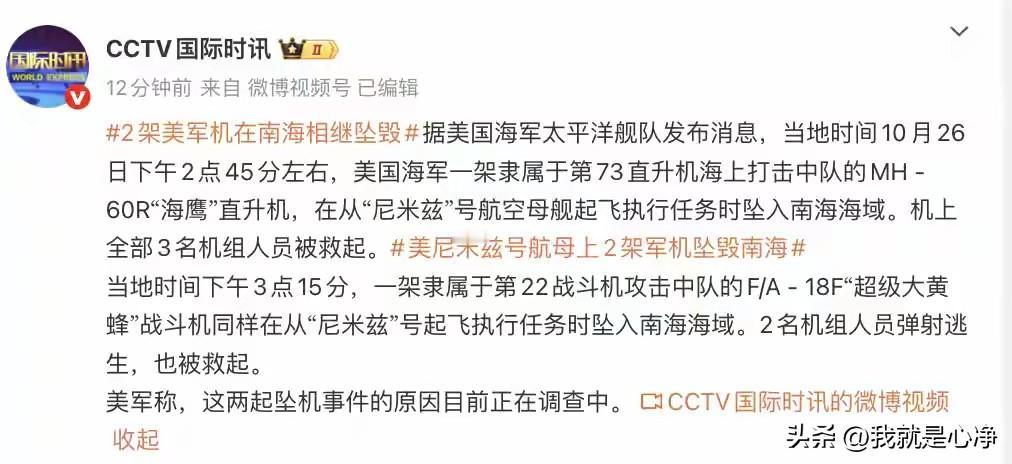 美国人这次真的是光着屁股推磨转圈丢人了。在中美谈判期间,特意把尼米兹号调到南海来,想着耀武扬威一把。 结果在不到一个小时之内,连摔两架战斗机。 我们国家也算是把羞辱玩到头了。 最新消息,就在今天稍晚一点时间,外交部新闻发布会上,咱们的发言人对全球媒体表示。 中方愿意从人道角度出发,向美方提供必要的帮助。 但是我们也要强调,美方的有关军机是在南海地区进行军演时候坠落的。 美方频繁的在南海地区炫耀武力,才是引发海上安全问题,破坏地区稳定的根源。 看看大家,看看!我们先答应可以出手帮助。 回头再损你一把。 我们能提供什么样的帮助呢? 当然是捞飞机的帮助了,你美国人会不会打捞啊?如果不会打捞,那就让我们来。 至于说捞上来的残骸,那我们肯定得先借着玩几天了。 虽然技术很落后,不是什么好东西,但是玩几天也是没关系的。 大家别看这飞机不是很先进,但是价格可不便宜啊。 海鹰直升机的单价就超过了1亿美元。 比F35还要贵。 就这种事情对于咱们来说都是不敢想象的。直升机比F35还要贵吗? 这是真的,反正他们对外的明账就是这个价。 路透社就曾经报道过印度政府批准过从洛克希德马丁公司采购24架海鹰直升机。 当时的总采购价就是26亿美元。 单价约为1.08亿美元。 您看看那位神秘的捐资者,前面捐了1亿3000万美元,后脚就让海军给摔了。 大家猜猜这是不是飞行员故意报复啊? 美国政府恶意欠薪连军饷都不给了,他们恶意报复。 故意把美国海军的国有资产给搞到海里面去。 大家想想有没有这种可能呢? 心净觉得可能性还是有的。 一口气掉下去两架呀。 现在心净我还能说什么呢?只能是呼叫81192。 呼叫81192看看现在这一幕吧。 美国实在是太丢人了,到现在一言不发,对外也没有一个说法。 究竟是什么原因造成的呢?他们自己也不开口。 这样吧,心净送给他们一个借口,五角大楼可以拿过去照抄使用。 就说事发海域下面的海床里面有一个超大型的磁铁矿。 这个磁铁矿不断的干扰飞机,还有航母上面的电子设备。 然后就造成了这次事故。 我觉得这个借口还是挺不错的,大家觉得呢? 光着屁股推磨转圈丢人啊! 特朗普现在正在亚洲访问呢,你说说让亚洲各国怎么看他呀?