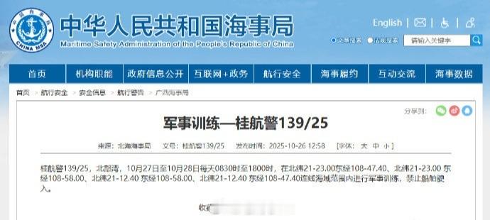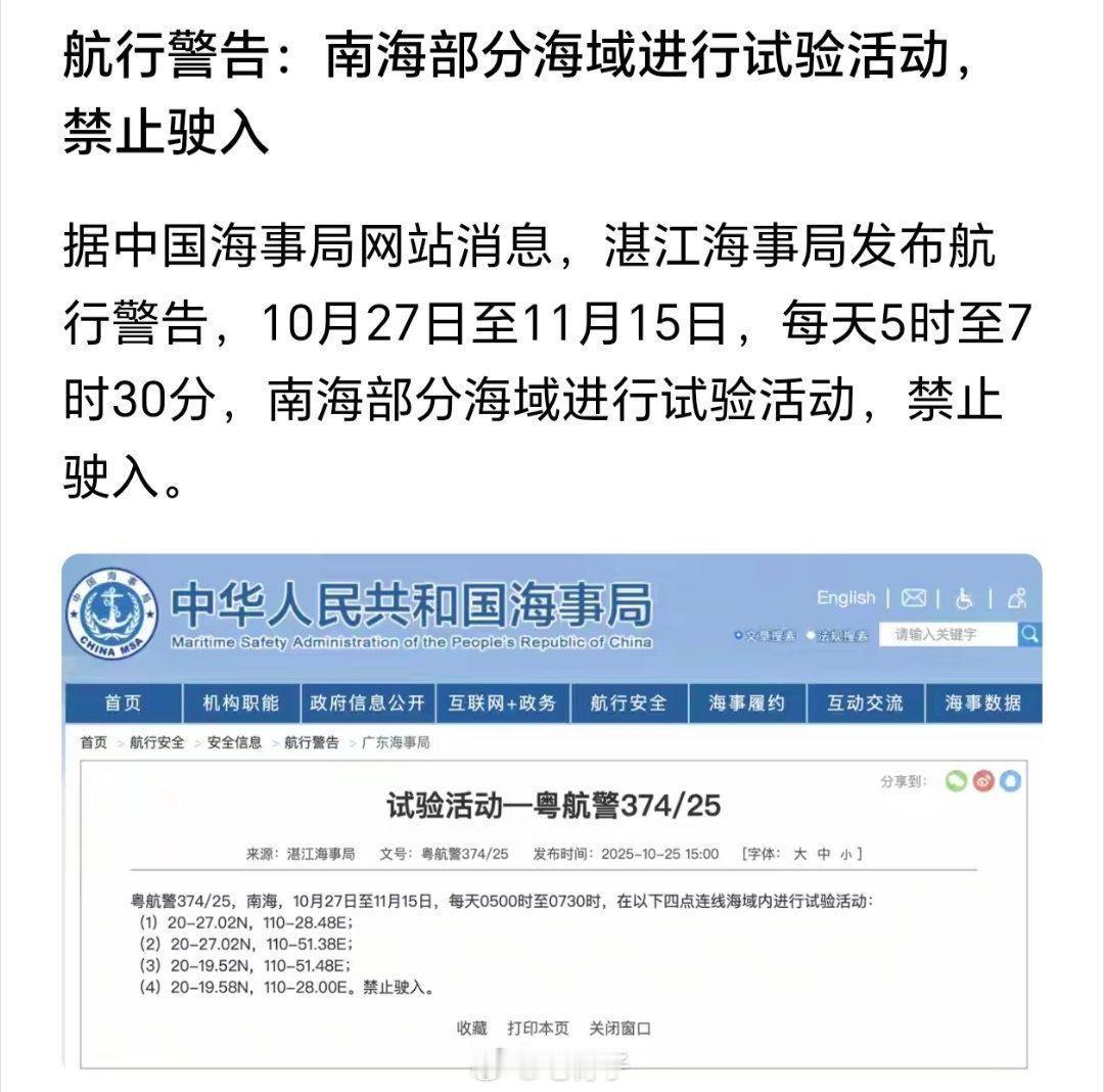 多地海事局发航行警告2025年10月27日"多地海事局发布航行警告":〔渤海潍