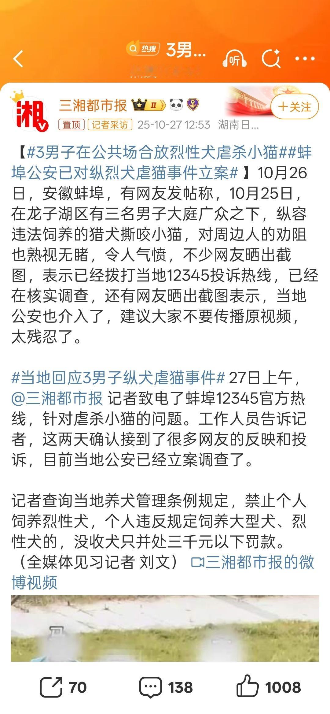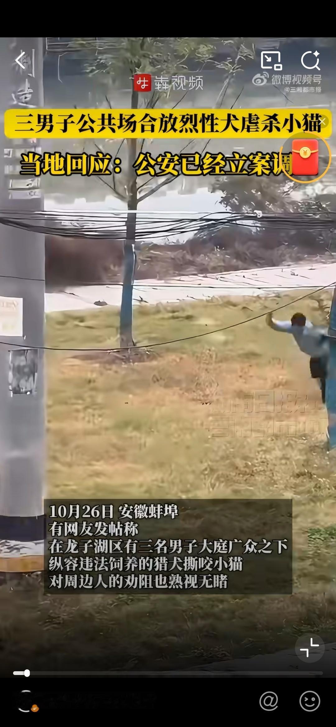 3男子在公共场合放烈性犬虐杀小猫太残忍了,公共场合如此行为非常不妥。而且这样训练出来的狗在城市里是很危险的,有可能会伤害人的。猎犬咬伤人的新闻可不少见。