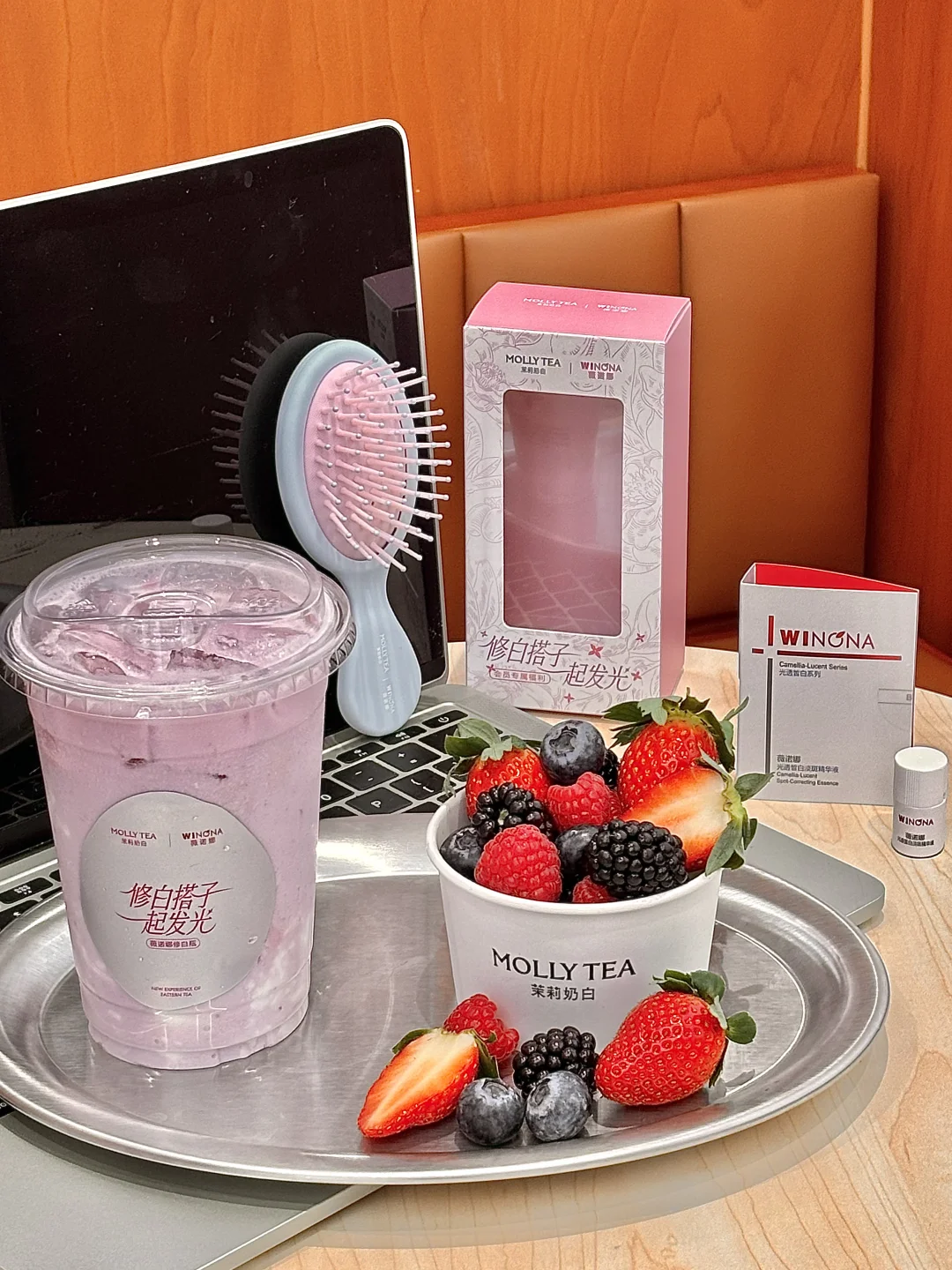 又是为茉莉奶白周边买单的一天…… 薇诺娜修白瓶、气垫梳!这谁看了不心动 茉莉奶白花青莓果软法酪搭配薇诺娜修白瓶就是“双白”cp 一杯奶茶就可以得到的白白,家人们都给我冲!!!