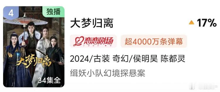 入青云拉动侯明昊在🥝的大梦归离飙升,毕竟一周年,抖点赞也还不错,剧粉都挺长情