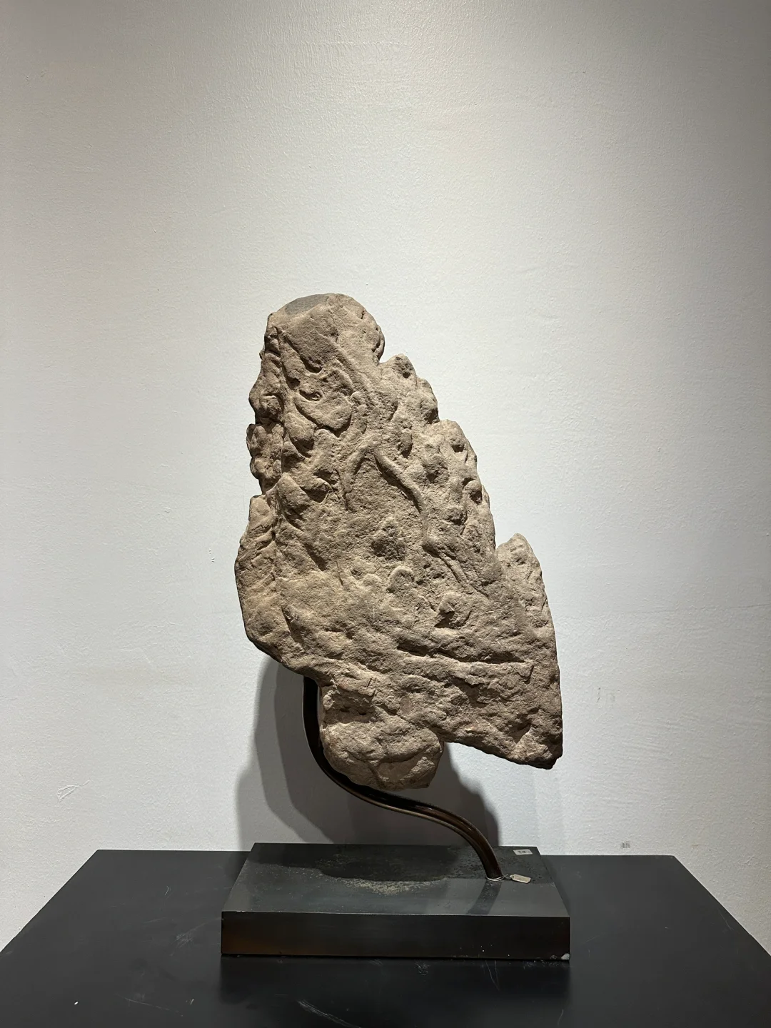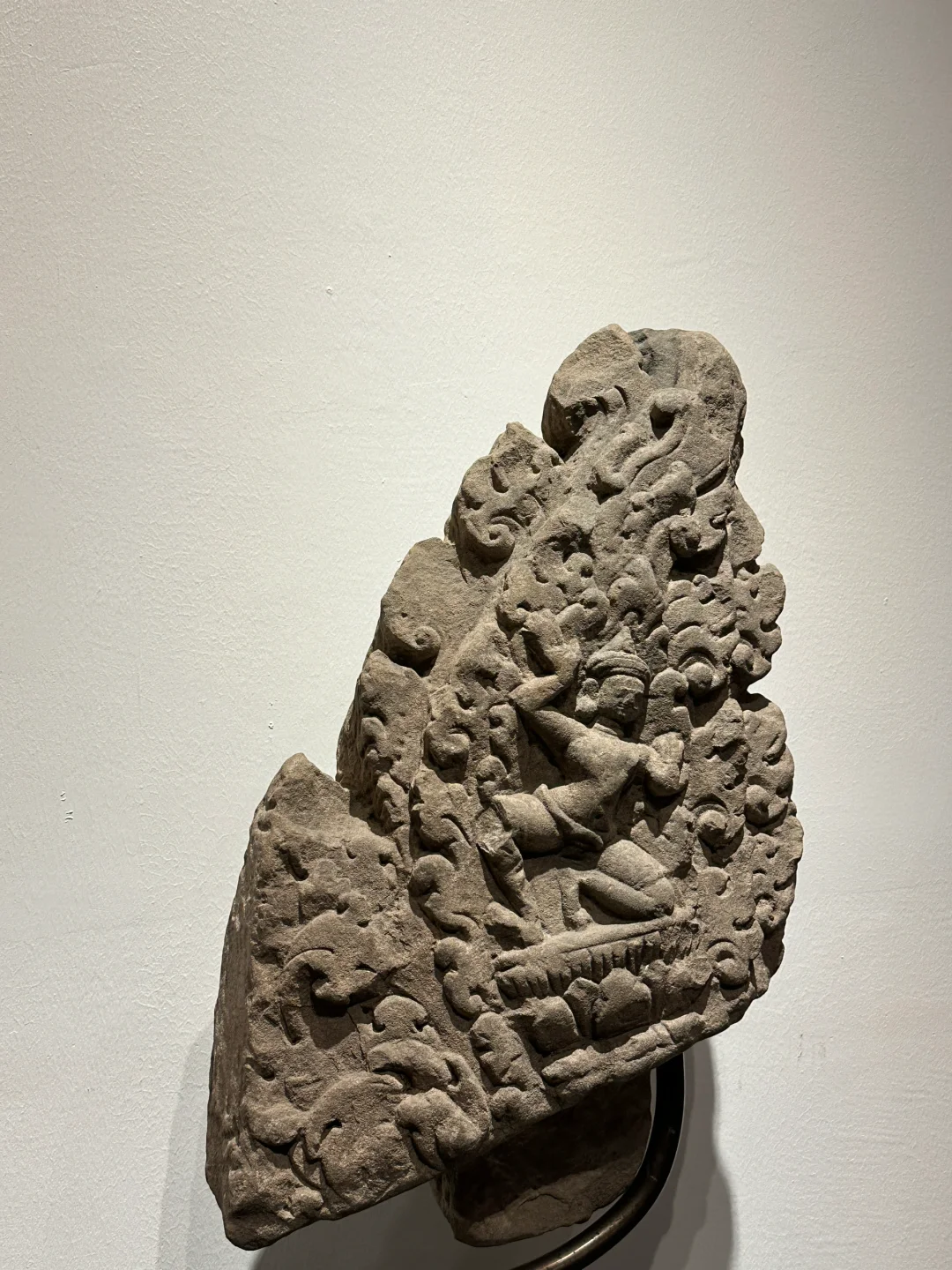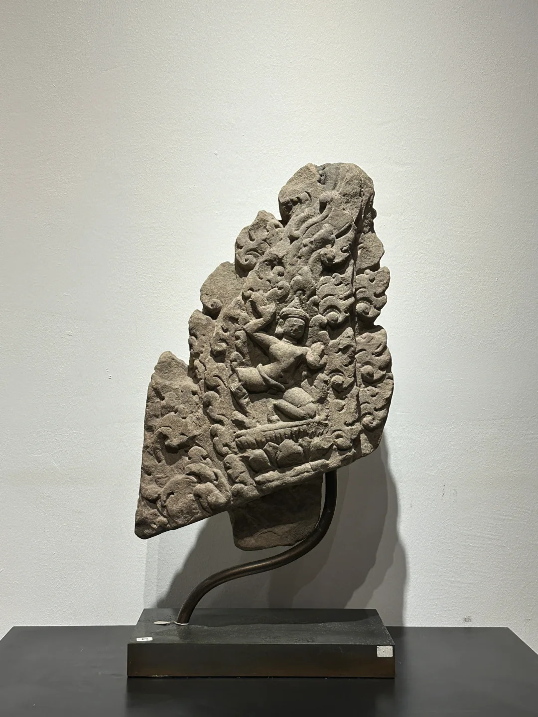 高棉10世纪 Pre Rup风格 跳舞的Indra浮雕建筑构件 Indra似乎在跳舞时很高兴,而他通常以皇家姿势坐着,尽管有例子表明他站着,甚至似乎在跳舞,他的双腿张开,正如我们在这里看到的那样。他戴着一个带耳坠的头饰、身体首饰和一个带有悬垂翻盖的褶皱吊带。他的右臂被抬起来,通常拿着一个金刚(雷电),这是他的主要属性。 Indra也是东方的dikapala和守护者,这意味着带有他形象的门楣将出现在朝东的寺庙门口。 傻开门 净高:50cm 总高:63cm 重量:25kg+-