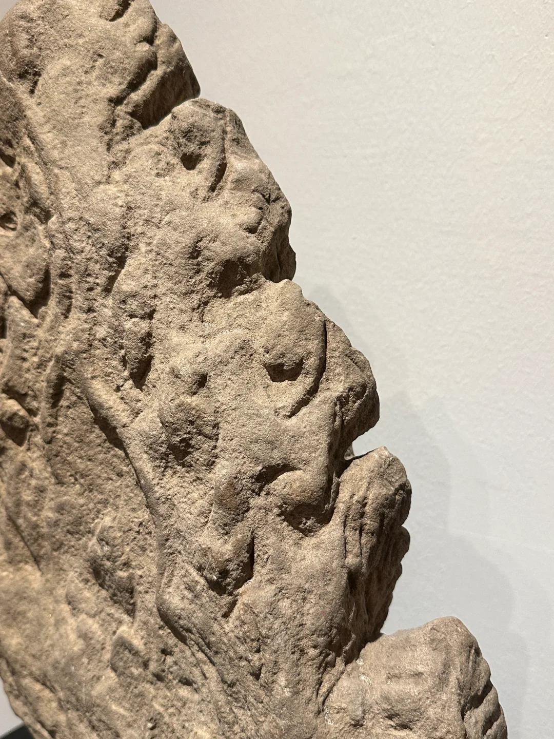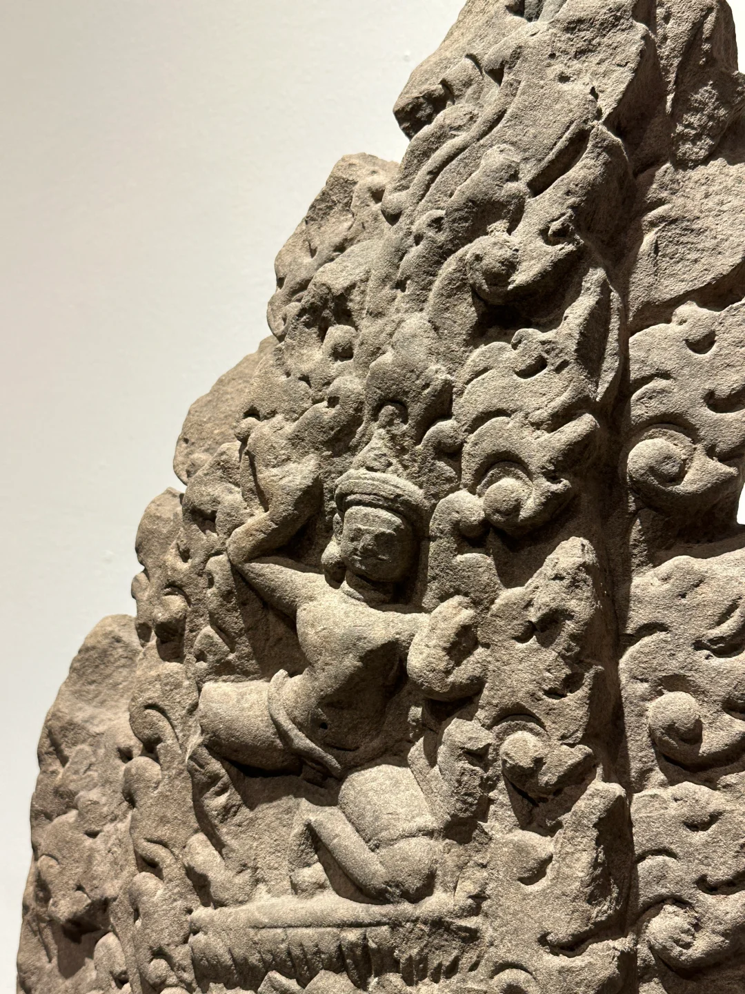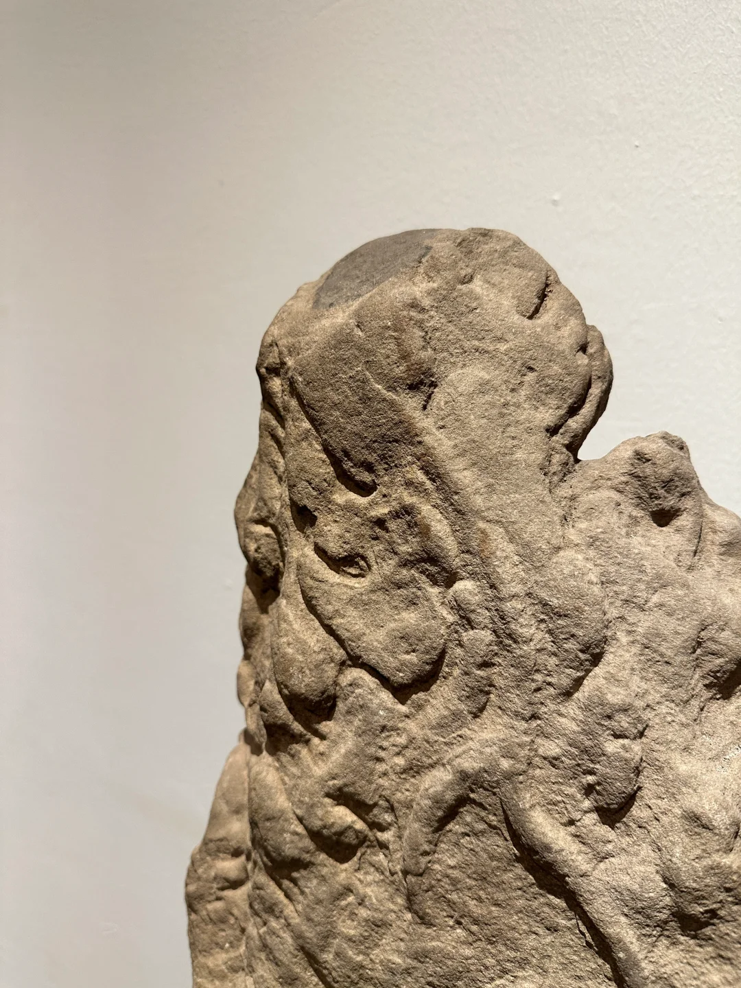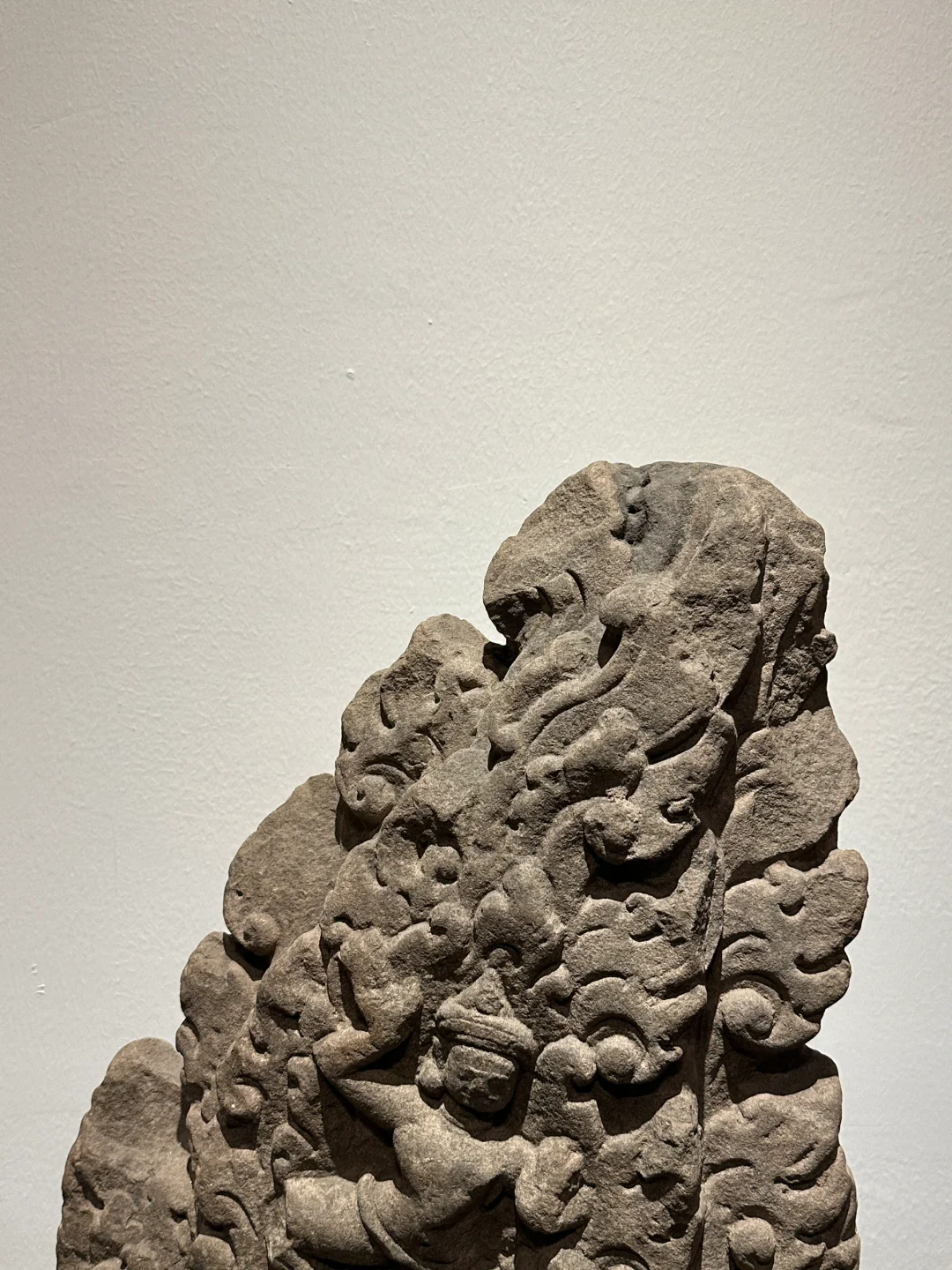 高棉10世纪 Pre Rup风格 跳舞的Indra浮雕建筑构件 Indra似乎在跳舞时很高兴,而他通常以皇家姿势坐着,尽管有例子表明他站着,甚至似乎在跳舞,他的双腿张开,正如我们在这里看到的那样。他戴着一个带耳坠的头饰、身体首饰和一个带有悬垂翻盖的褶皱吊带。他的右臂被抬起来,通常拿着一个金刚(雷电),这是他的主要属性。 Indra也是东方的dikapala和守护者,这意味着带有他形象的门楣将出现在朝东的寺庙门口。 傻开门 净高:50cm 总高:63cm 重量:25kg+-