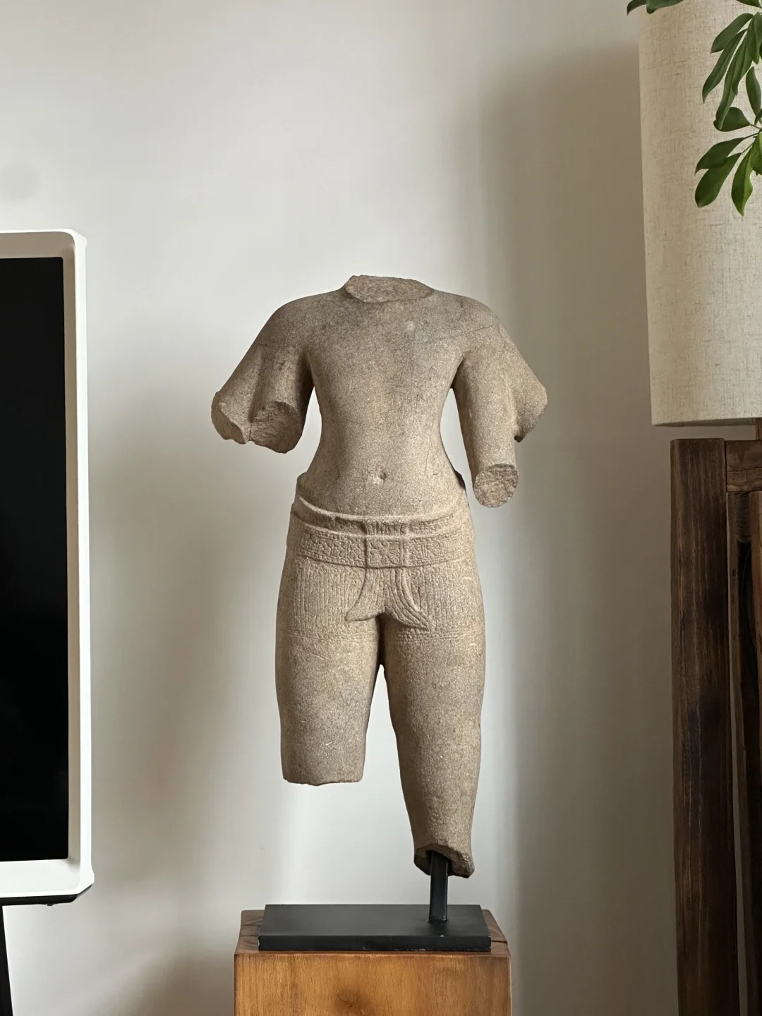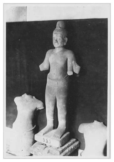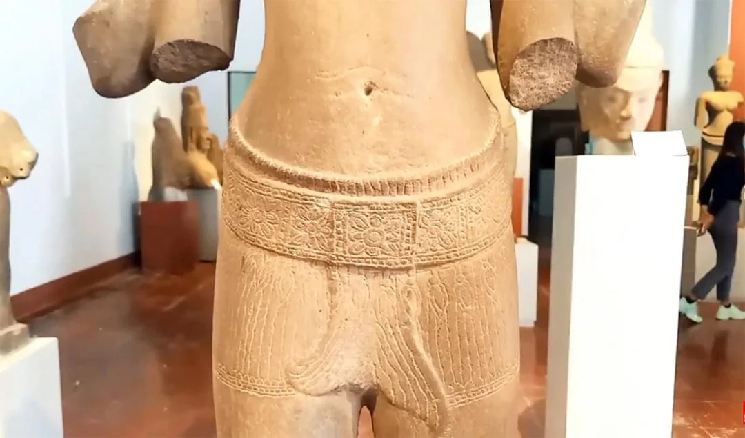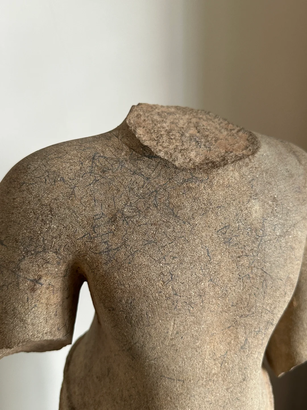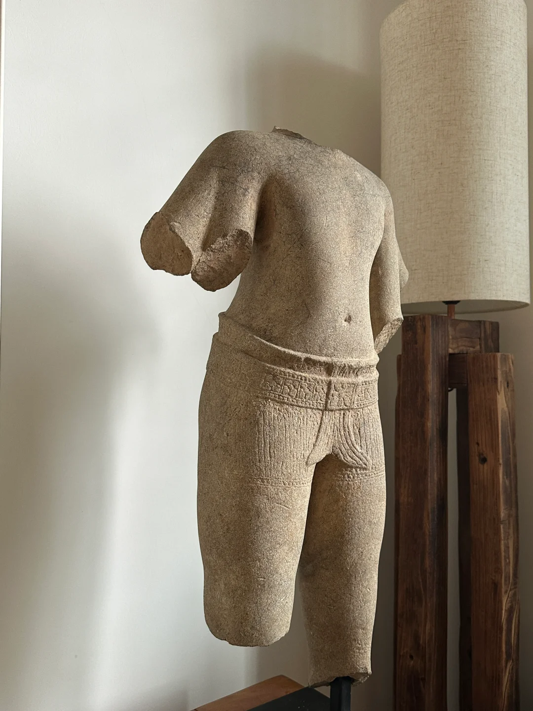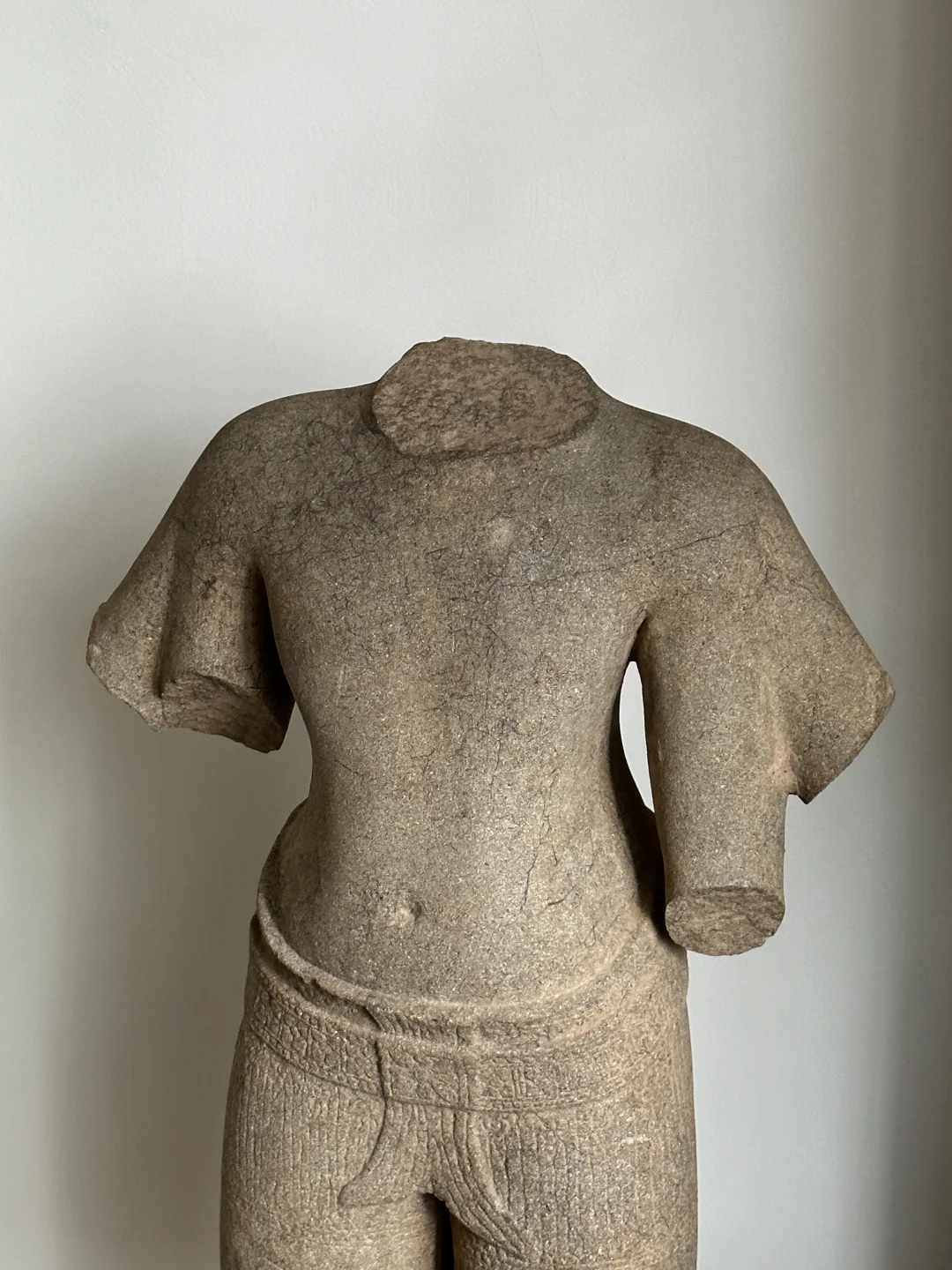高棉13世纪 Bayon巴戎寺风格 四臂观音lokeshvara躯干 非常大的躯干,皮壳很漂亮,风化自然,完整尺寸应该有1米。唯一的其他装饰是带腰带的桑波特,后面和前面都有鱼尾褶皱。13世纪闍耶跋摩七世统治期间观音被推崇为主神,在高棉王国重要人口地区占中心位置。在其统治结束后大多数佛教造像被狂热的湿婆教信徒破坏。 净高:64cm 总高:72cm 重量:45kg+-
