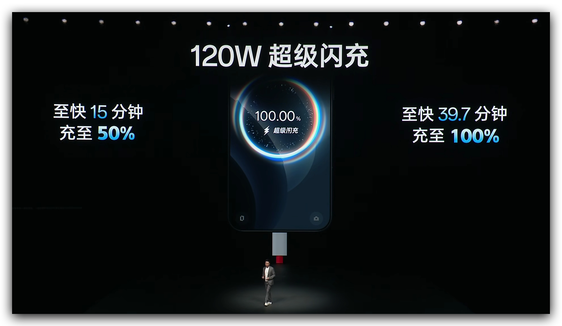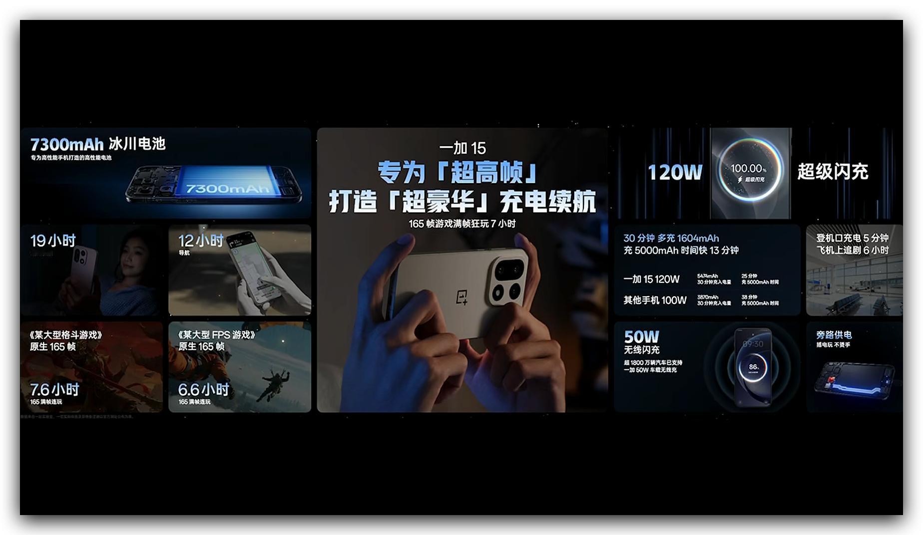 一加15 搭载了7300mAh大电池,支持120W闪充,50W的无线闪充;可以实现连续19小时刷短视频,连续12小时导航,游戏满帧9小时运行;120W闪充,15分钟可以充至50%,39.7分钟充至100%,虽然功率上看似只比 100W 高出 20W,但实际充电速度却快了 13分钟,实现了真正的代际领先!一加15和Ace6新品发布一加15