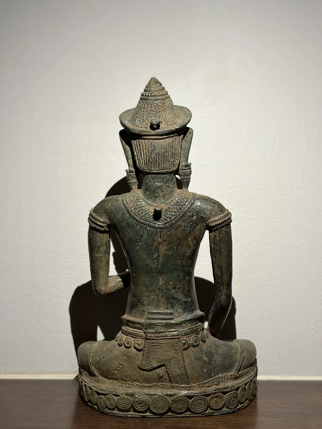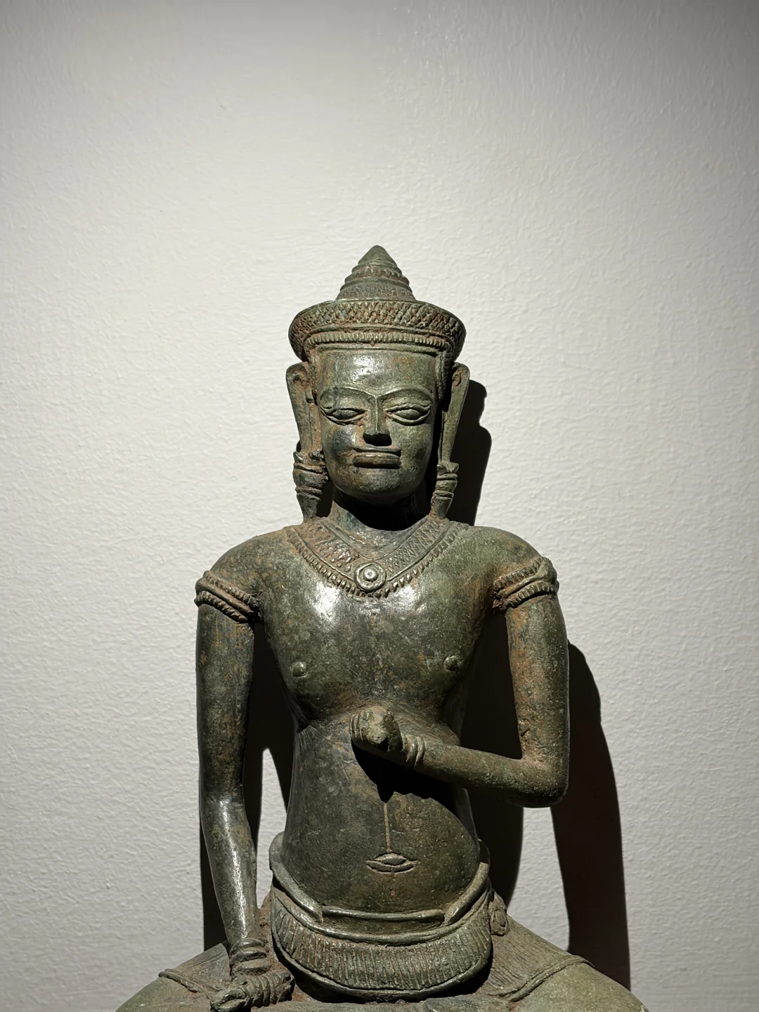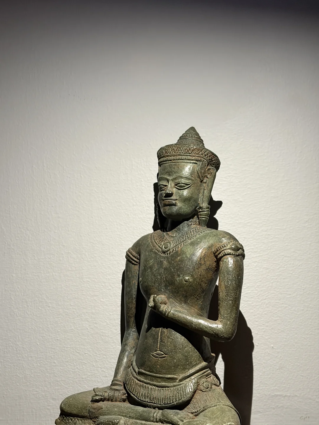 高棉12-13世纪 Lopburi风格Vajrasattva(金刚萨埵)青铜造像 13世纪是吴哥王朝从巴戎寺风格向后巴戎寺风格过渡的时期。随着上座部佛教的兴起,对大乘佛教和密教神祇如Vajrasattva的崇拜依然存在,但风格发生了变化。 Vajrasattva是密教中非常重要的本尊,象征“菩提心”和一切诸佛的清净智慧。 持金刚杵与胸间,象征“方便”或“慈悲”。持金刚铃于腰间,象征“智慧”。通常是全跏趺坐(莲花坐姿),姿态端庄宁静。 12世紀,金刚乘思想在高棉贵族中流行起來,金刚乘的崇拜与印度教和佛教並肩而行。 身材比巴戎寺风格的造像更显修长和优雅,肌肉感减弱,强调一种纤细、柔和的体态。肩膀较窄,腰部细。所穿的桑卡(腰布)非常短,通常刚刚盖过大腿根部。这是Lopburi风格的另一个典型特征。佩戴项圈、臂钏、手镯和脚镯。这些珠宝的造型通常比较精致,但不如头冠那样突出。 高度:25cm 宽度:13.5cm 深度:7cm