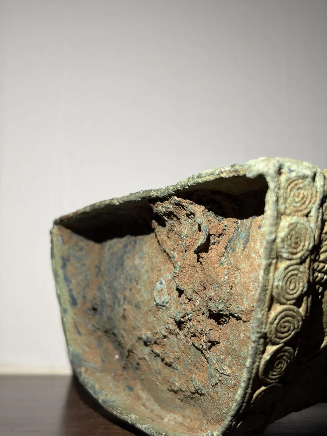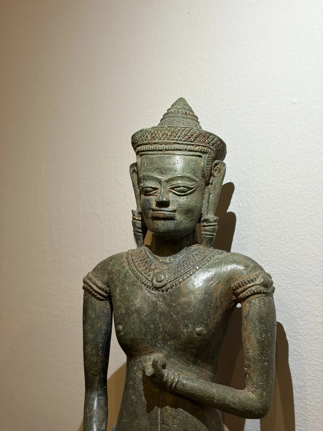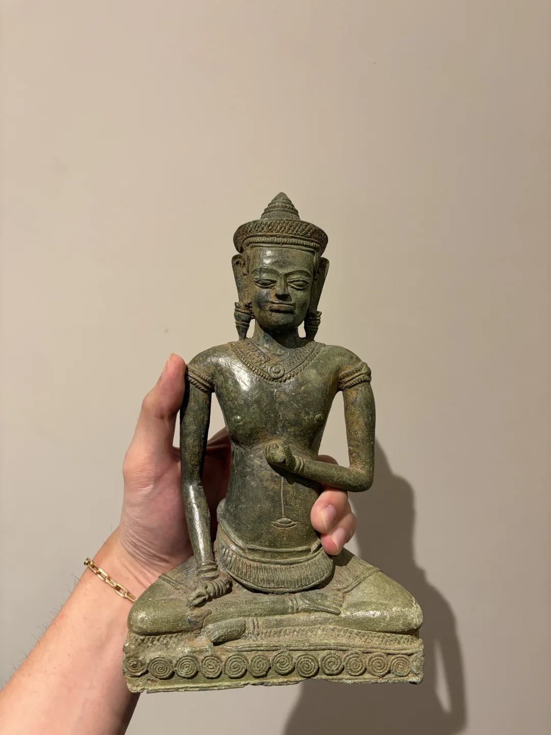 高棉12-13世纪 Lopburi风格Vajrasattva(金刚萨埵)青铜造像 13世纪是吴哥王朝从巴戎寺风格向后巴戎寺风格过渡的时期。随着上座部佛教的兴起,对大乘佛教和密教神祇如Vajrasattva的崇拜依然存在,但风格发生了变化。 Vajrasattva是密教中非常重要的本尊,象征“菩提心”和一切诸佛的清净智慧。 持金刚杵与胸间,象征“方便”或“慈悲”。持金刚铃于腰间,象征“智慧”。通常是全跏趺坐(莲花坐姿),姿态端庄宁静。 12世紀,金刚乘思想在高棉贵族中流行起來,金刚乘的崇拜与印度教和佛教並肩而行。 身材比巴戎寺风格的造像更显修长和优雅,肌肉感减弱,强调一种纤细、柔和的体态。肩膀较窄,腰部细。所穿的桑卡(腰布)非常短,通常刚刚盖过大腿根部。这是Lopburi风格的另一个典型特征。佩戴项圈、臂钏、手镯和脚镯。这些珠宝的造型通常比较精致,但不如头冠那样突出。 高度:25cm 宽度:13.5cm 深度:7cm