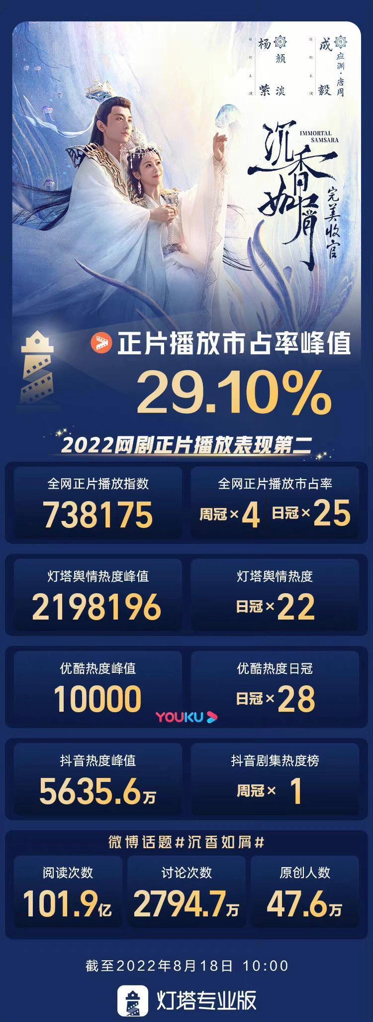 ❷二番《沉香如屑》,开播49小时热度值破10000,是优酷平台最快破万的剧集。