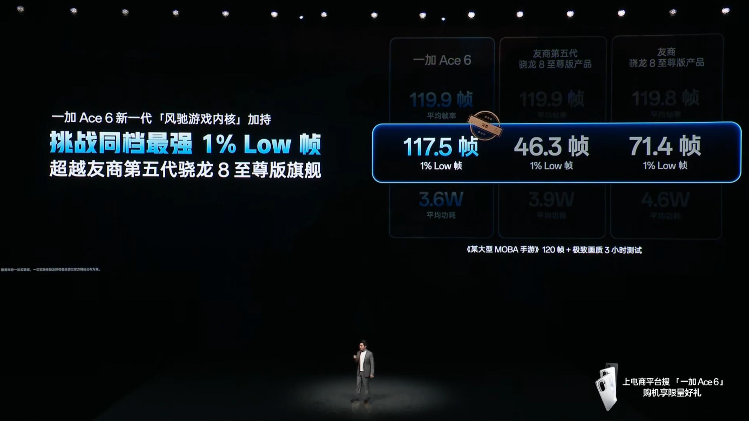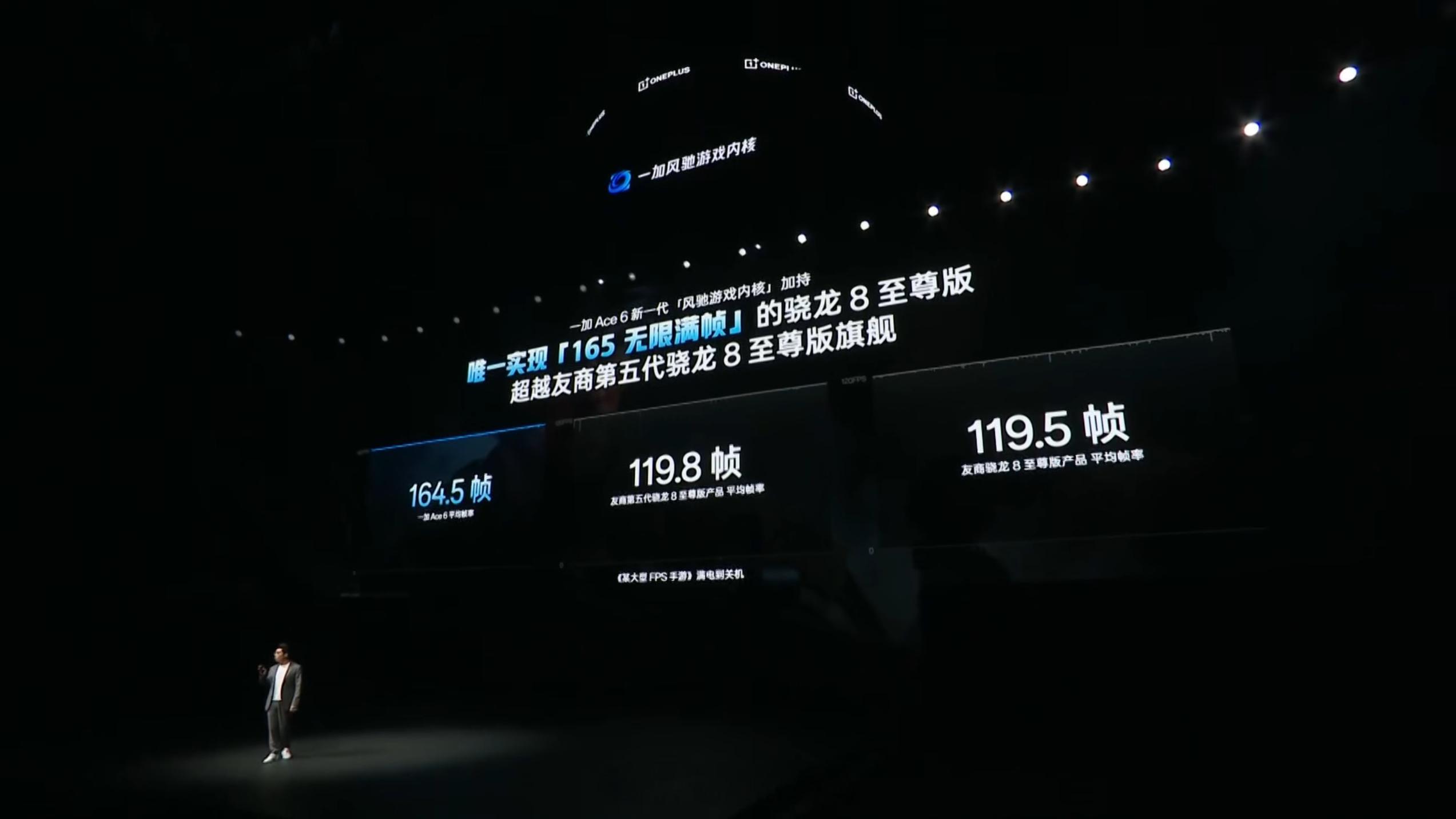一加 Ace 6 搭载骁龙 8 至尊版移动处理平台,LPDDR5X Ultra 内存,UFS 4.1 闪存,全新风驰游戏内核,冰河散热系统(大平层冰河 VC),自研电竞网络芯片 G2、灵犀触控芯,自研 Display P3 屏幕芯片