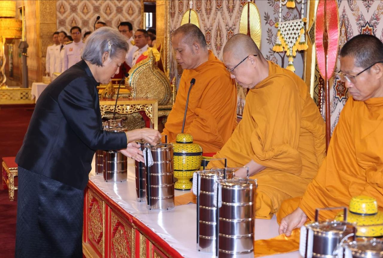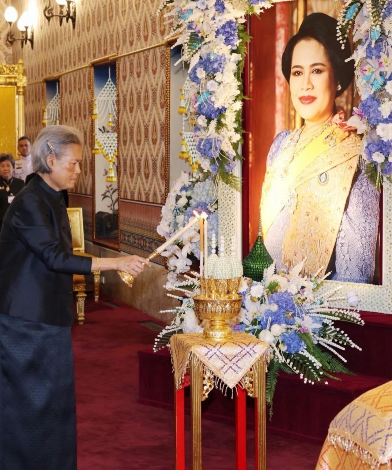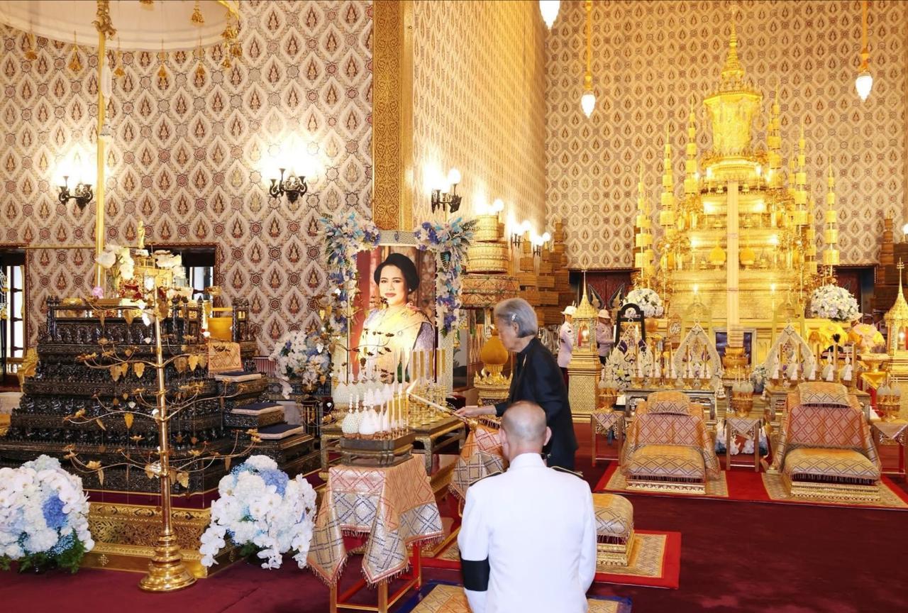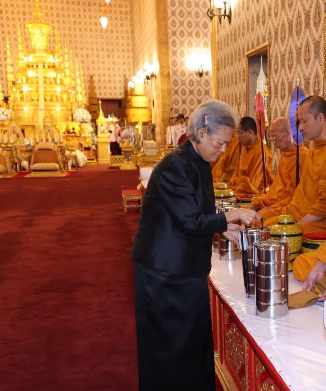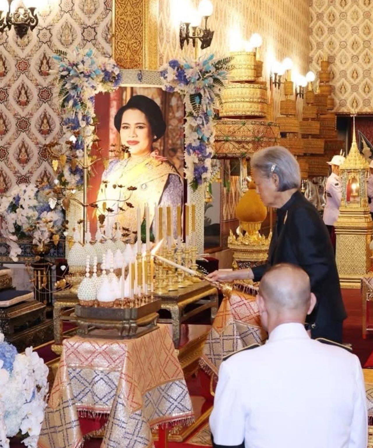 诗琳通公主祭拜母亲,满头白发令人心疼 10月27日,诗琳通公主殿下,于大皇宫杜斯特玛哈普拉萨王座大厅,为已故诗丽吉王太后主持功德法会,场面庄严肃穆。 值此之际,国王陛下于王室瓮前敬献花圈。盛放太后遗体的大型金瓮置于九层白伞下的金色宝座,周围阳伞、金银树环绕,尽显尊崇。 此次,泰国历史上首次授予王后最高级别王室荣誉,与君主比肩,足见诗丽吉王太后地位之高、贡献之大。国王陛下还仁慈准许昼夜进行佛教诵经仪式,安排僧侣享用早午饭、午饭,百日斋期间演奏佛乐,以虔诚之心缅怀太后,寄托无尽哀思与敬意。