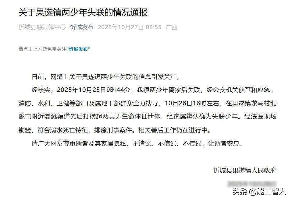电瓶车停在桥上,孩子却没了,水渠为啥没护栏? 10月25号上午九点多,广西来宾两个十三岁的男孩骑着电瓶车出门,说是要去钓鱼,他们从村里出来,一路上没人拦,也没人觉得不对,当天晚上家里发现人没回来,赶紧发寻人启事,邻居也帮忙找,可直到第二天下午四点多,救援队才在几公里外的灌溉渠里找到他们,人已经没了。 他们的电瓶车还停在桥边,手机和鱼竿都在车上,一点没动,说明不是打架,也不是被人拉走,八成是自己下车后掉进水里了,那座桥是浇地用的,不是给人走的,没护栏,水又深又急,平时根本没人管,孩子们可能以为就是条小河,结果一脚踩空就出事了。 搜救拖了好长时间,头天晚上村民就在附近沟里找过,可地方太小,没找着,真正专业的人是第二天下午才到,中间隔了快一整天,没定位,没监控,也没用无人机或者热成像,全靠人一条路一条路跑着找,镇政府说多部门一起查,可到底用了啥工具,调没调监控,一个都没说清楚。 这种灌溉渠在广西、云南、湖南好多地方都有,就是种田用的,不算公共安全项目,所以没人去装护栏,2023年云南出过一回类似的事,上面发过通知叫排查,可地方没钱,责任也说不清,到底该水利局管,还是村委会管,还是乡镇管,谁也说不准。 这两个孩子骑的电瓶车,村里到处都是,国家说十二岁以下不能骑,可也没人管,村里没公交,也没地方玩,小孩想出门,只能靠这车,他们不是故意淘气,就是想去河边看看,可那边没给他们留活路,家长是不是在外打工,有没有顾不上管,官方没提,但村里不少家都是这样,孩子自己待着,大人在外地。