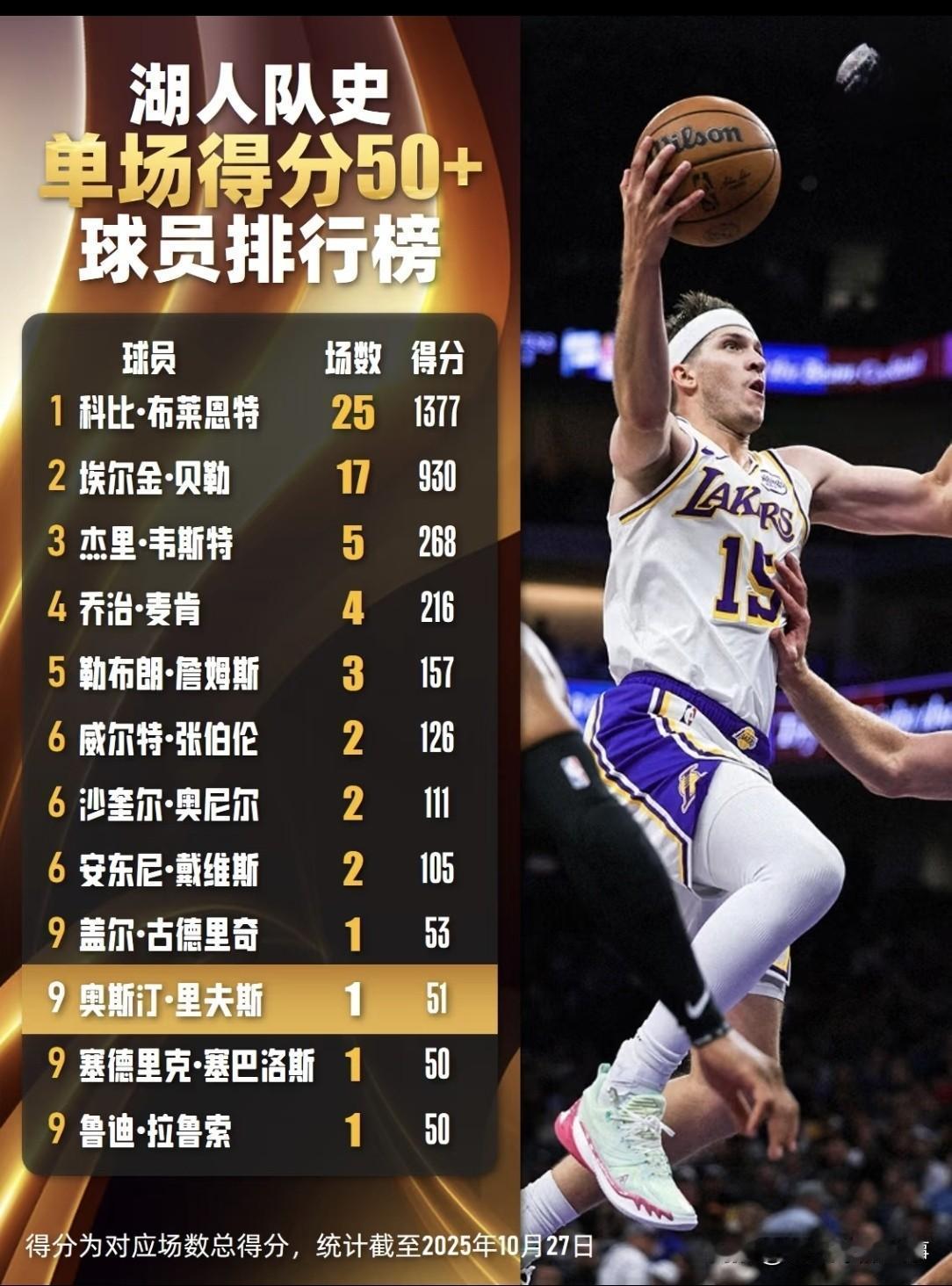 湖人队史单场得分50+排行榜:科比25次断档领先,尤其81分神迹后人仰止;贝勒17次紧随其后,剩余球员都是5次以下了;詹姆斯拿到3次,戴维斯和奥尼尔都是2次,里夫斯荣耀入围!东契奇尚未拿到过50+得分,前一场拿到49分距离进榜单一步之遥!