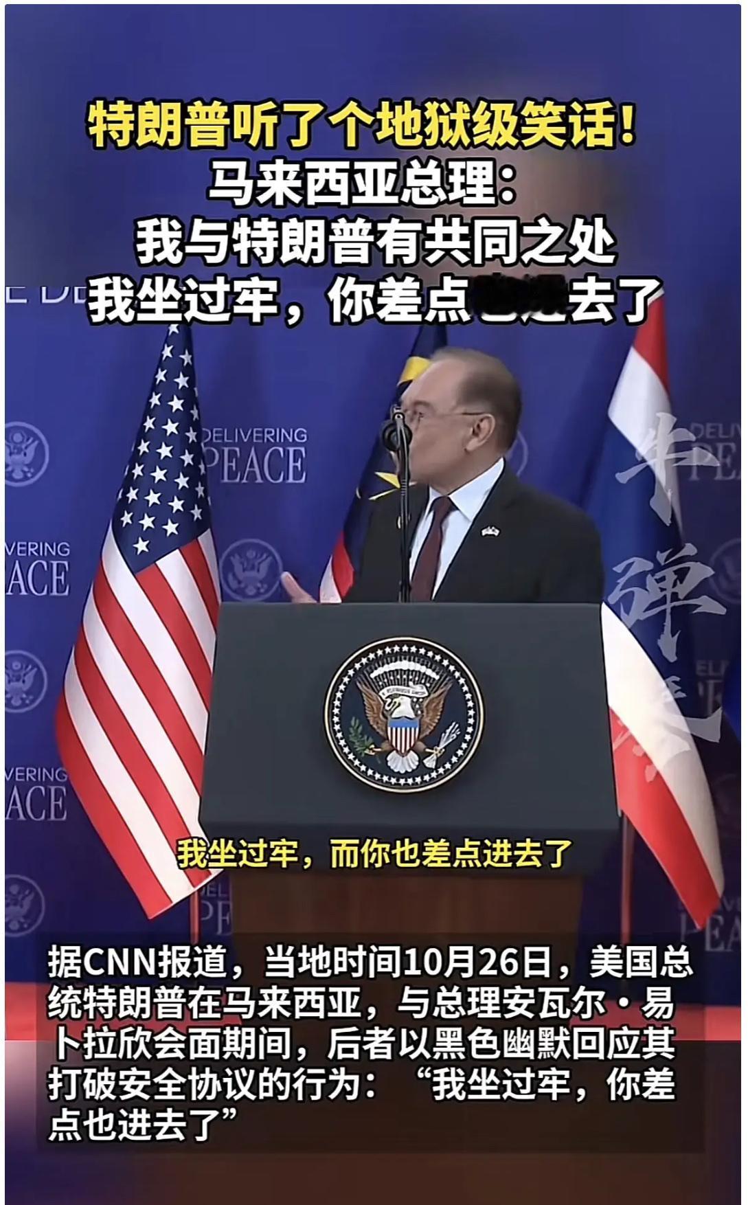 特朗普被马来西亚总理搞尴尬了 在刚刚进行的东盟峰会期间,马来西亚总理为了和特朗普套近乎,于是在公开演讲中对特朗普说:“我与特朗普总统有相近之处, 我坐过牢,而你也差点进去坐牢”。 这不是妥妥的诅咒吗?诅咒特朗普以后也会坐牢[捂脸][捂脸][捂脸][捂脸] 网友说:马来西亚总理应该想说:我坐过牢,你早晚也会进去的![捂脸][捂脸][捂脸] 又有网友说:马来西亚总理这“套近乎”绝了,哪壶不开提哪壶,特朗普估计心里都在犯嘀咕咯!