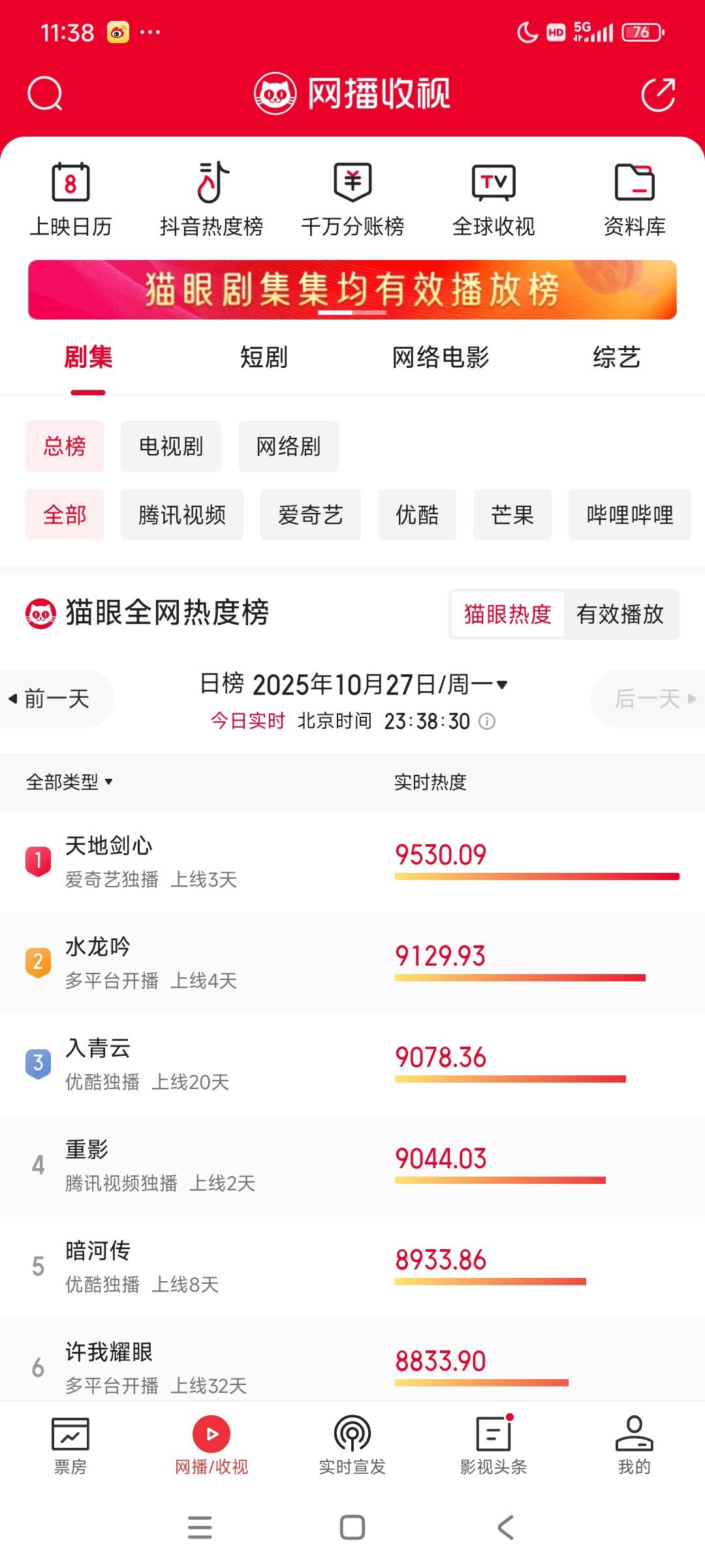 天地剑心第三???刚去看了下,成毅天地剑心昨日登顶猫眼热度总榜第一了呀!好厉害!