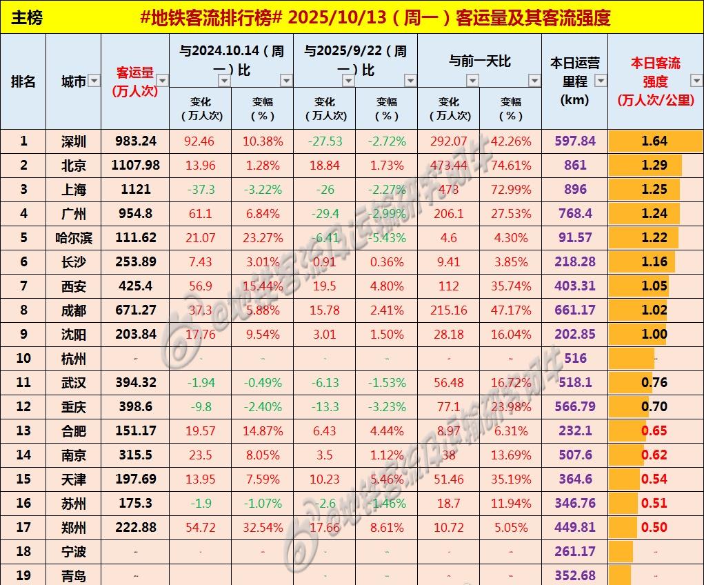 【中国城市地铁客流排行榜2025-10-13(周一,农历八月廿二,中国地铁客流
