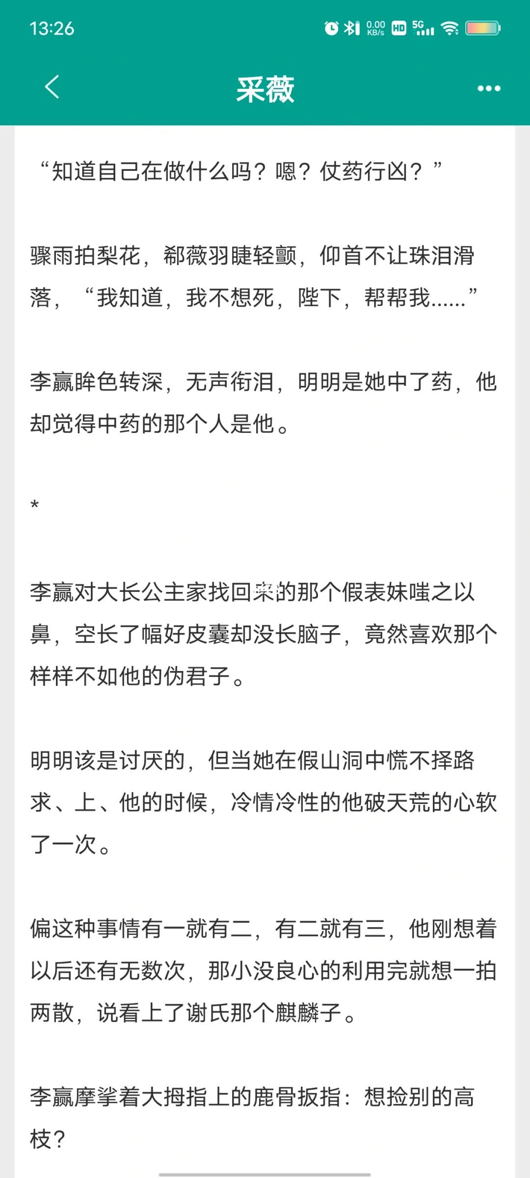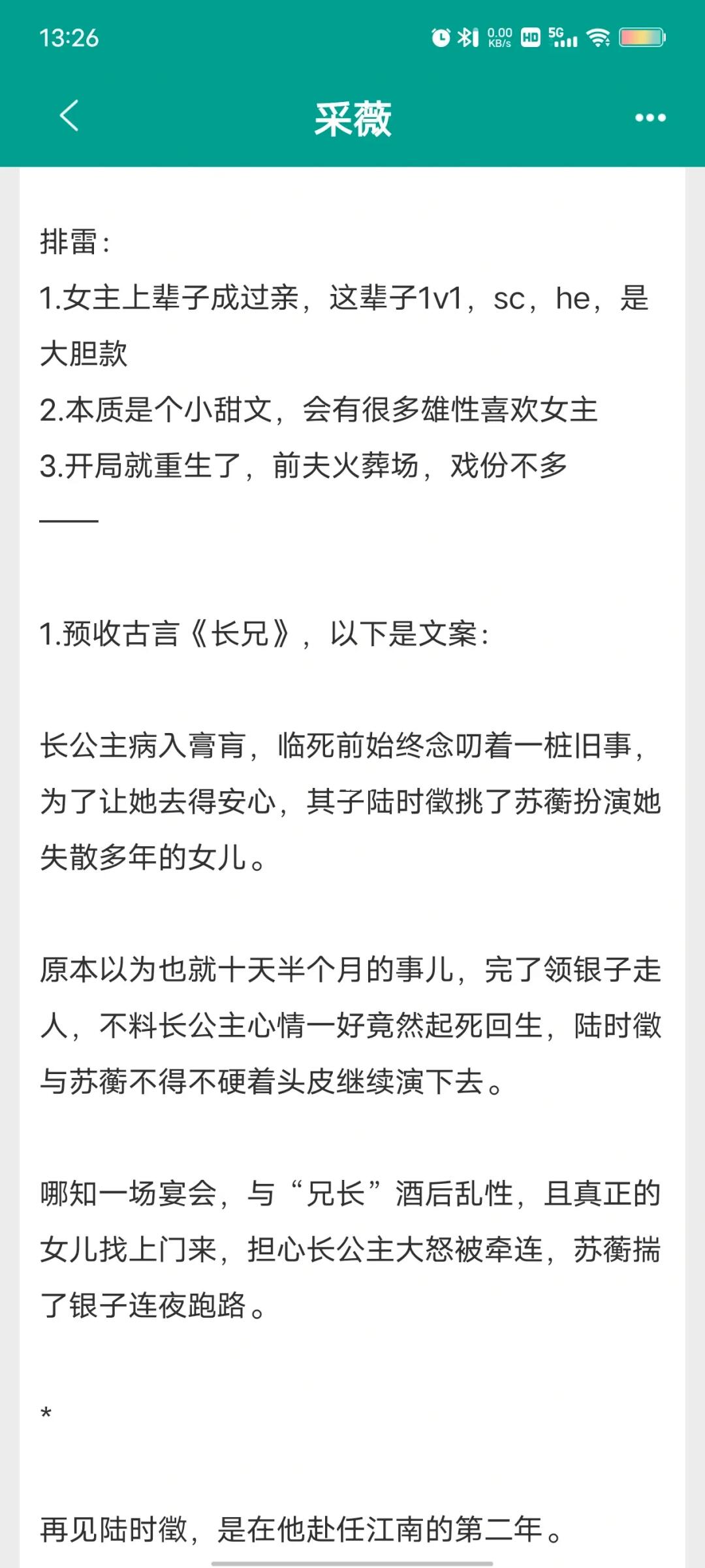 《采薇》by小菜清粥 7月完结的文,一共90章 女主是嫁千金重生换男主 有些情节转折没写好,有点生硬仓促。 作者排雷: 1.女主上辈子成过亲,这辈子1v1,sc,he 2.本质是个小甜文,会有很多雄性喜欢女主 3.开局就重生了,前夫火葬场,戏份不多