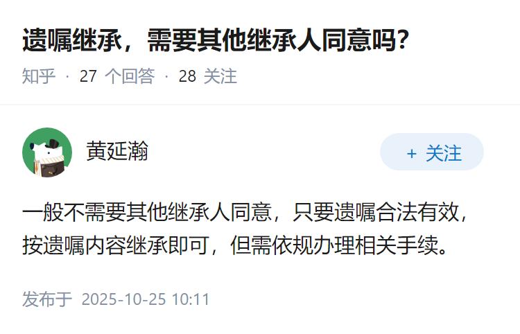 遗嘱继承,需要其他继承人同意吗?