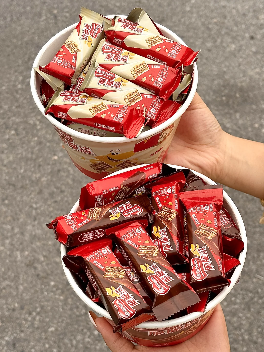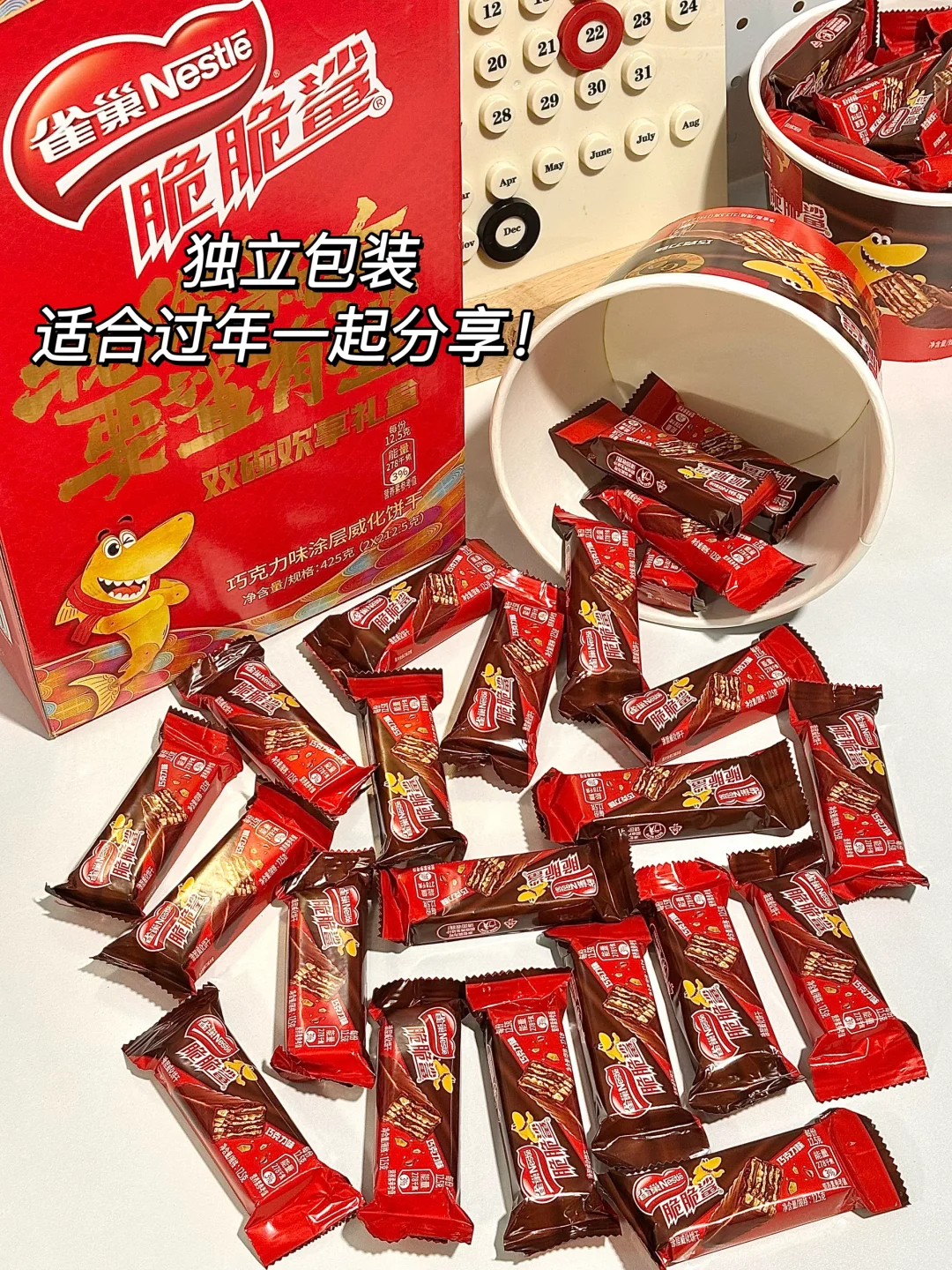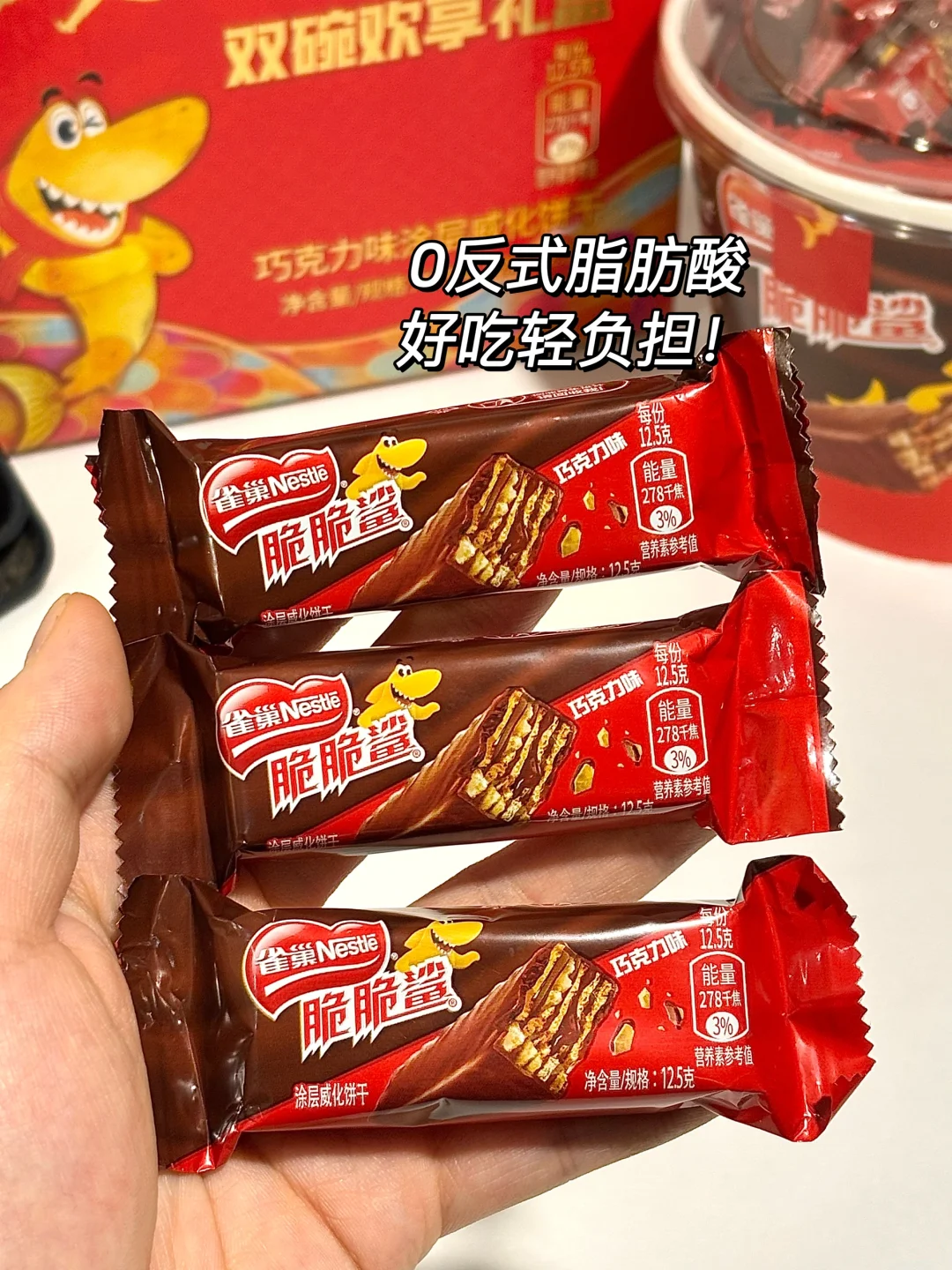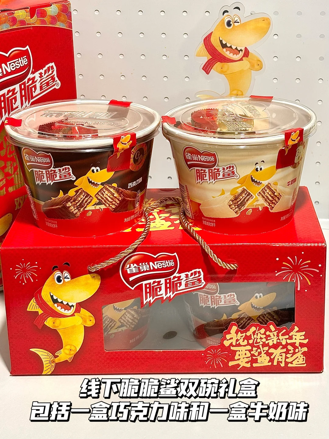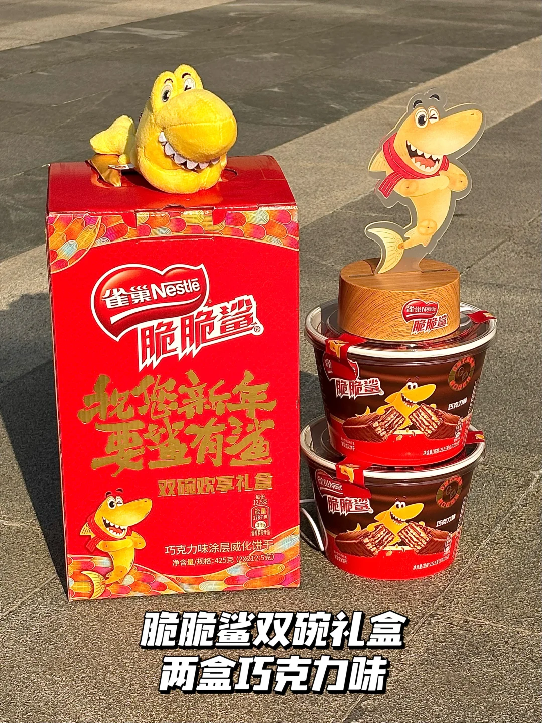转眼间又快过年了 送礼成了我眼前的一道难题了,预算几十块钱买什么才能实用又有排面? 在红薯上刷到了脆脆鲨出的年货礼盒! 完全是我们这代人的童年记忆 立马入了! - 就是这个👉🏻脆脆鲨双碗欢享礼盒👈🏻 蛇年新春礼炮造型好应景!红红火火的包装 贼喜庆 节日氛围拉满! 礼盒里面有两碗脆脆鲨经典巧克力威化 二十年了 经典就是经典 还是一样的好吃不腻! 外面是丝滑浓郁的巧克力味涂层 包裹着五层威化四层夹心! 香醇进口可可粉搭配酥脆的威化 九层丰富口感 一口下去好满足! 以前每次家里人都不让多吃,没想到脆脆鲨原来是0反式脂肪酸,那现在过年我可以嘎嘎炫了! 独立包装 很适合过年的时候和亲朋好友一起分享! - 脆脆鲨新出的周边也可可爱爱的!是鲨鱼小夜灯和毛绒鲨鱼挂件! 逛超市的时候还发现双碗礼盒还有这个新年橱窗设计的版本!果断入手了! 里面除了巧克力味之外,还有牛奶味的威化!添加了品质乳粉奶香浓郁! 过年不知道送礼送什么的家人们都给我冲!