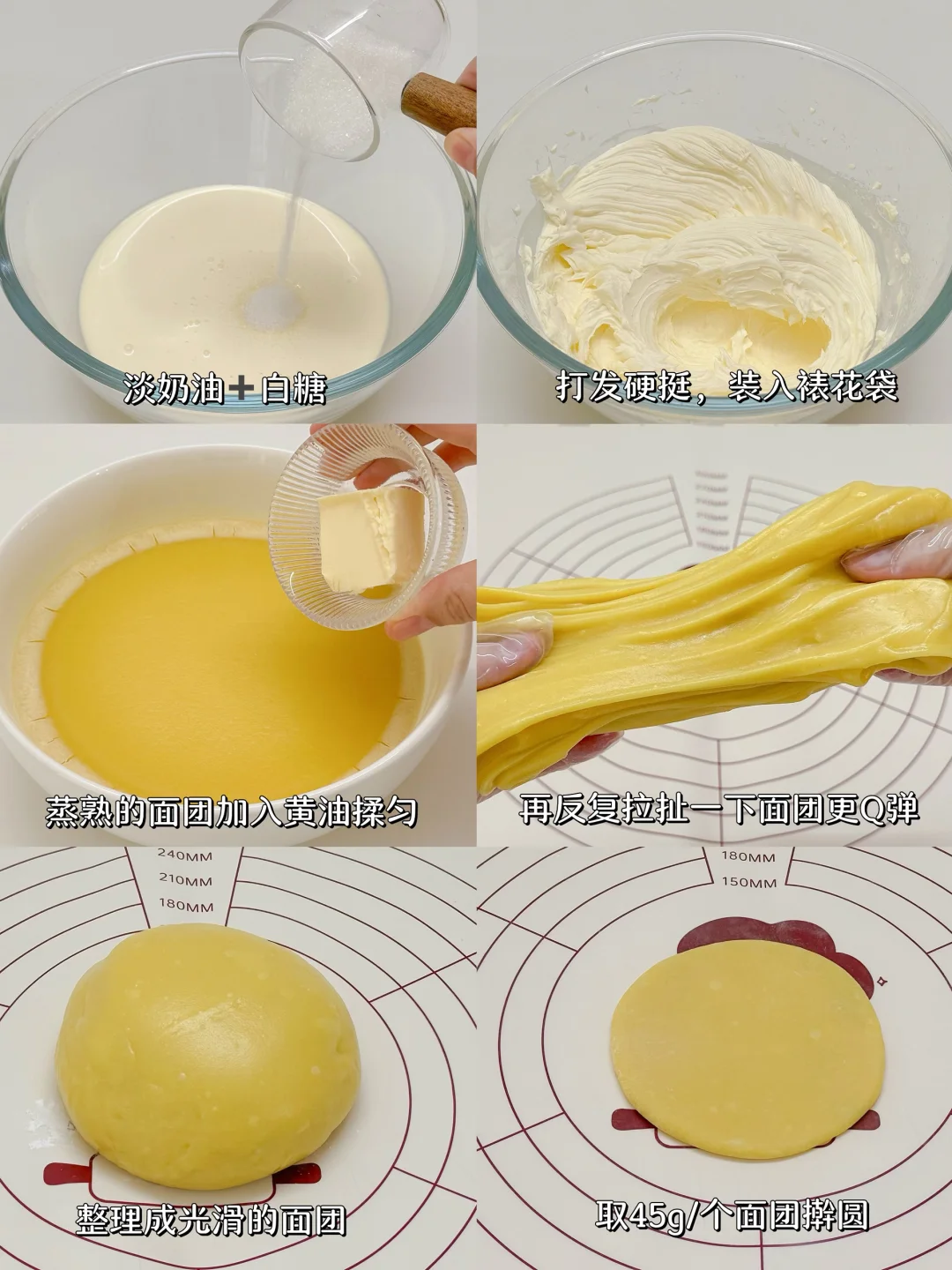 3️⃣蒸熟的面团加入黄油揉匀,再反复拉扯一下面团更Q弹,整理成光滑的面团。