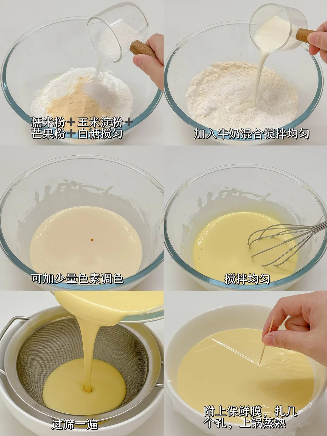 1️⃣糯米粉➕玉米淀粉➕芒果粉➕白糖搅匀,加入牛奶混合搅拌均匀,再加少量色素调色搅拌均匀,过筛一遍,附上保鲜膜,上锅蒸熟。