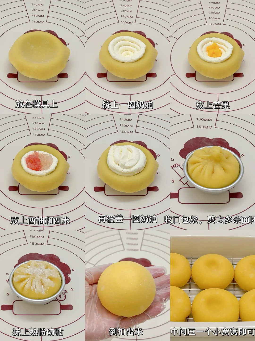 4️⃣取45g/个面团擀圆放在模具上,挤入一圈奶油,放上芒果、西柚和西米,再覆盖一圈奶油,收口包紧,剪去多余面团,抹上熟粉防粘,倒扣出来,中间压一个小窝窝即可。