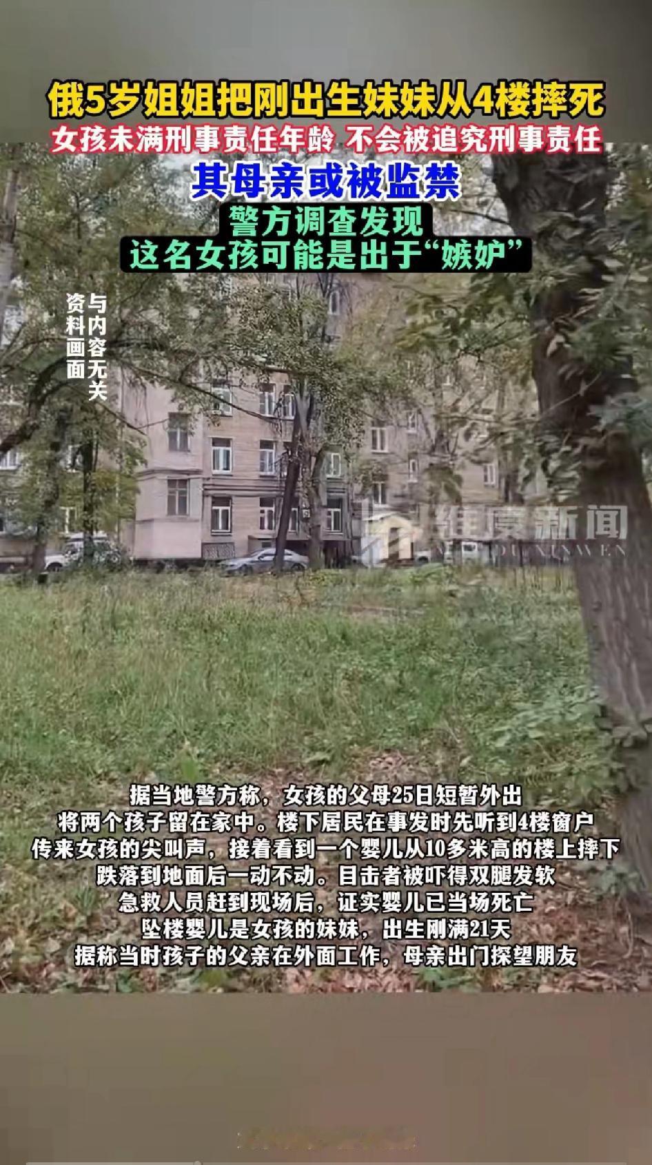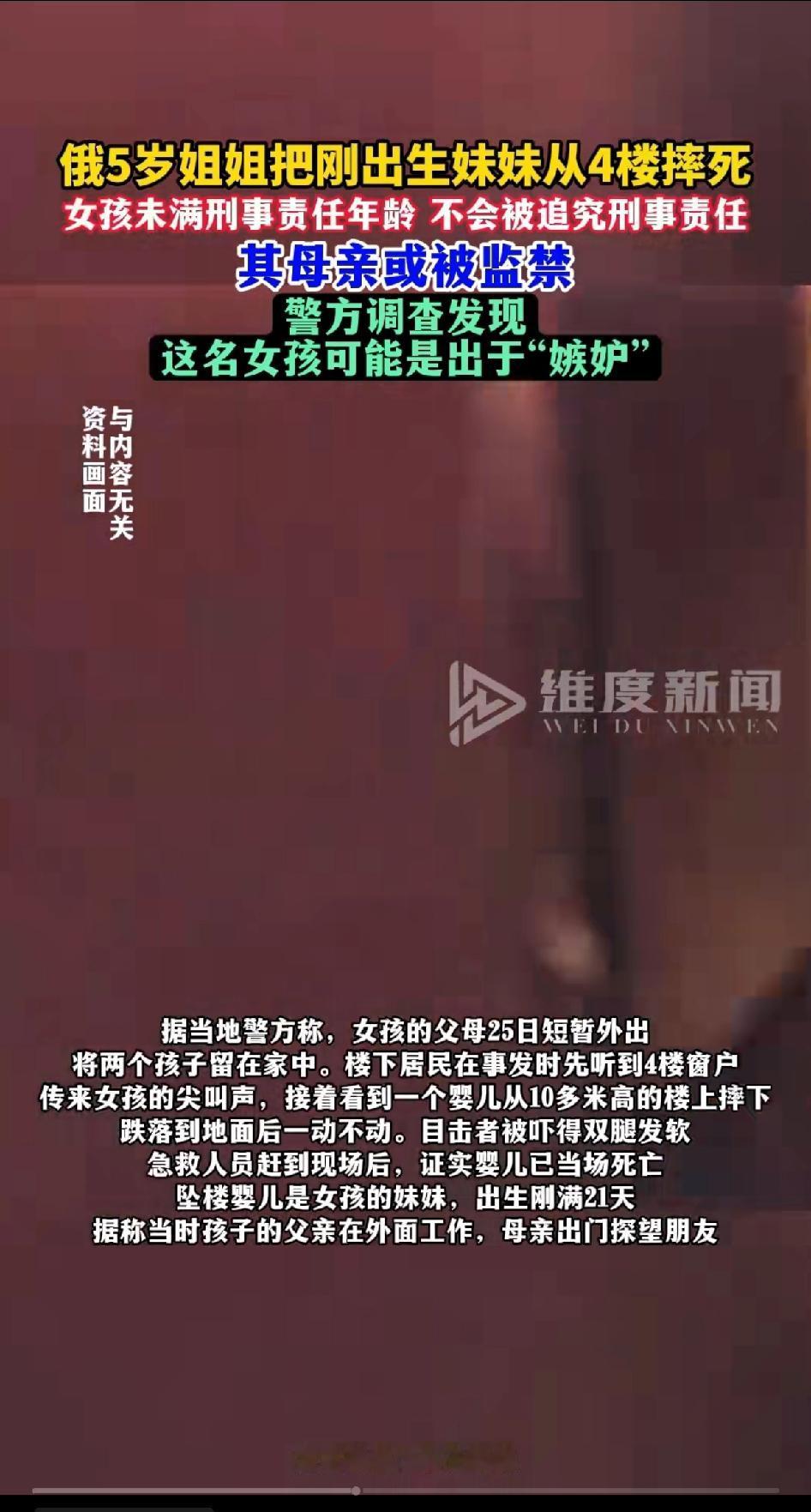 俄5岁姐姐将刚出生不久的妹妹从4楼摔死。女孩未满刑事责任年龄,不会被追究刑事责任,其母亲或被监禁。 俄罗斯鞑靼斯坦共和国发生了一起令人痛心的悲剧。 一名5岁女孩将出生仅21天的妹妹从四楼公寓窗户扔出,婴儿当场死亡。 事发时,父亲在工作,母亲出门探望朋友,把两个孩子独自留在家中。 事发前楼下居民先听到女孩的尖叫声,接着一名女婴从楼上掉落下来, 跌落到地面一动不动。 目击者看到后被吓得双腿发软,急救人员赶到现场后,发现女婴已当场死亡。 这妈妈心够大的,把出生21天的孩子留在家中,自己去会朋友。 警方调查发现,5岁女孩可能出于“嫉妒”才动手。由于女孩未满刑事责任年龄,不会被追责,但可能接受心理评估。而调查重点是母亲的疏忽,她可能面临刑事指控甚至监禁。 两个孩子的父亲在外面工作情有可原,可母亲把幼童单独留家,实在是太大意了。 都已经生二胎了,应该有带孩子的经验,怎么大意到把两个那么小的孩子独自留在家中。 这确实是母亲疏忽大意造成的。 有了二胎没有好好跟老大沟通怎么跟妹妹相处,把所有注意力都放到老二而忽略了老二,才导致5岁的孩子“嫉妒心”太强把妹妹从楼上摔下来。 希望类似的悲剧不要再发生。