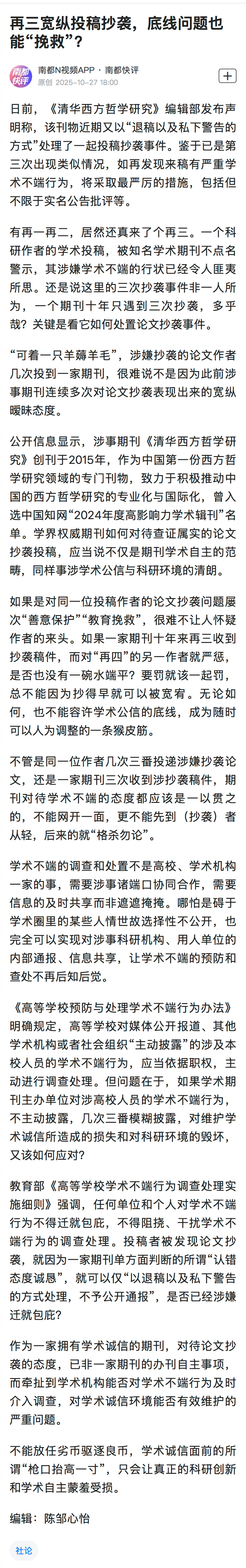 #学术期刊再三宽纵抄袭该当何责#【南都快评:再三宽纵投稿抄袭,底线问题也能“挽救”?】日前,《清华西方哲学研究》编辑部发布声明称,该刊物近期又以“退稿以及私下警告的方式”处理了一起投稿抄袭事件。鉴于已是第三次出现类似情况,如再发现来稿有严重学术不端行为,将采取最严厉的措施,包括但不限于实名公告批评等。