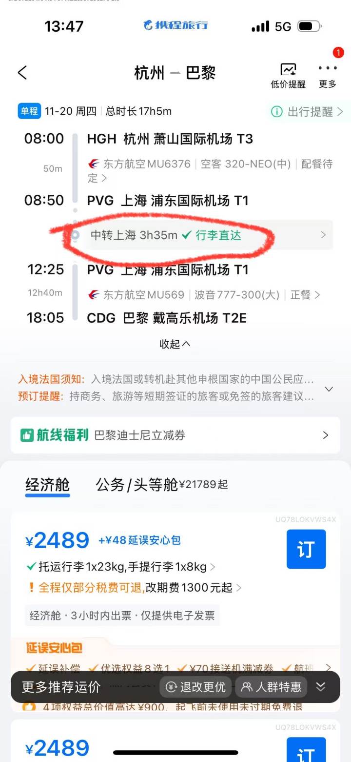 以杭州飞往法国巴黎为例,目前杭州未开通直飞巴黎航线,但可以通过这趟接驳航班,在上海中转,休息3个多小时后再飞往巴黎。这个航线提供“一票到底、行李直挂、无缝中转”的服务。