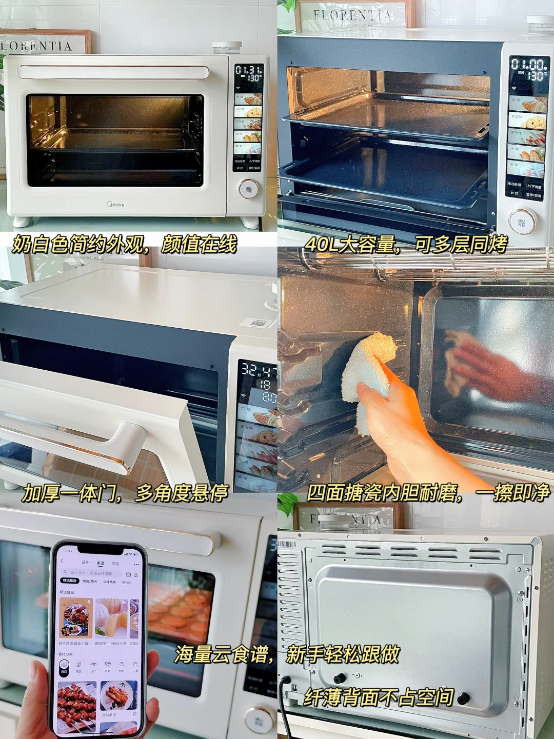 💕简约的奶白色外观,家用40L大容量可胜任各种烘焙模具及多层同烤.大彩屏➕旋钮设计,新手不看说明书也能轻松驾驭