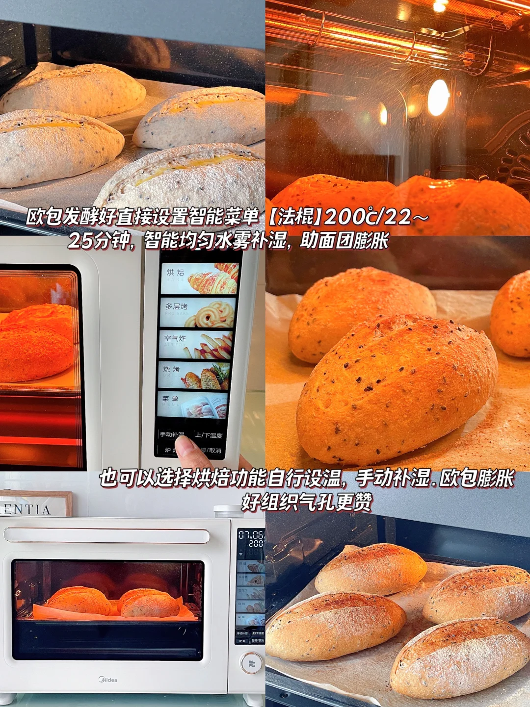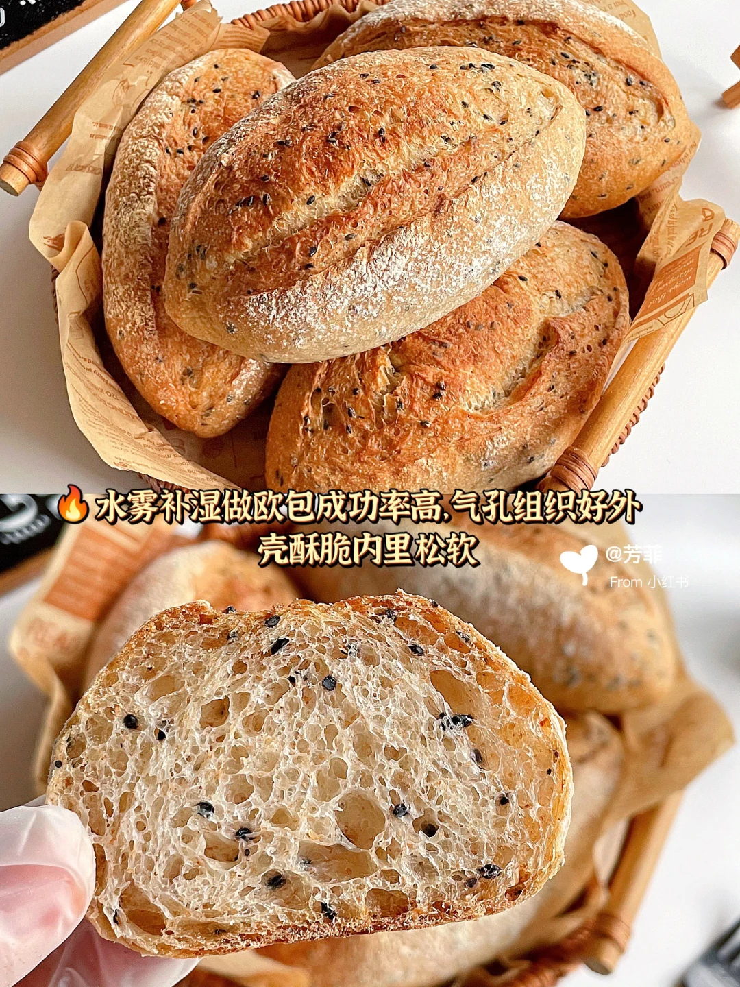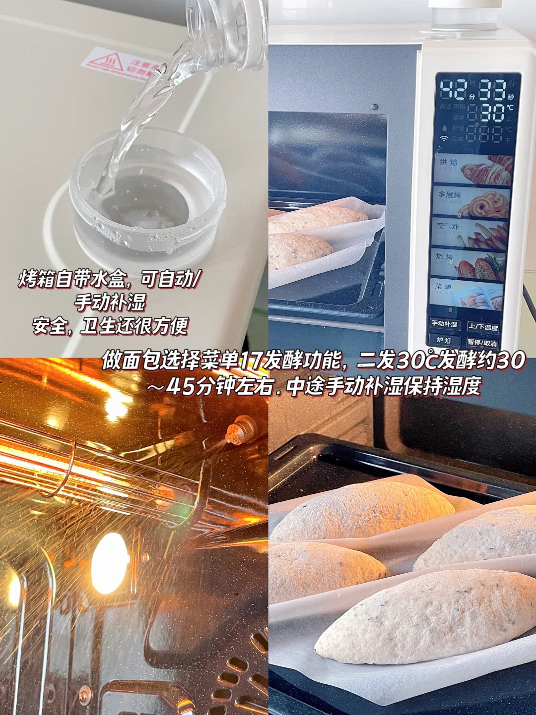 💕烤箱顶端右侧配有水盒,可手动补湿也可智能菜单自动补湿.这个做欧包比较占优势,用它做了免揉全麦黑芝麻欧包,发酵用菜单17发酵模式,发酵好割包入炉选择智能菜单【法棍】200℃/22~25分钟,水雾补湿细腻均匀,高温快烤释放面团爆发力,烤好的欧包气孔均匀外壳酥脆内里松软很成功