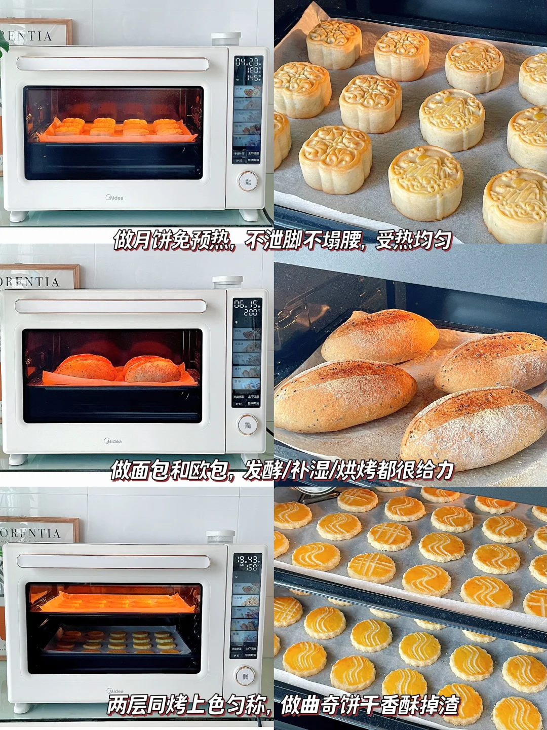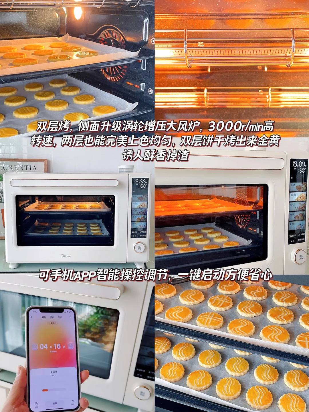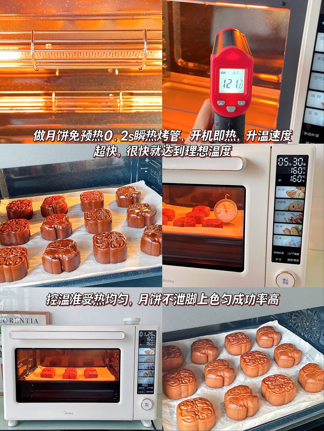 💕搭载 0.2s瞬热烤管,开机即热,快速升温,免预热也能直接烤.日常烘焙省事又省时,升温快也很适合做酥点类美食.内置NTC双感温探头+美的PID3.0控温技术,精准控温温差小烘焙不用担心翻车。用它烤月饼免预热,180℃定型6分钟,再160℃/15分钟,出炉不泄脚不塌腰,纹路清晰立体,色泽金黄口感酥软甚是好吃