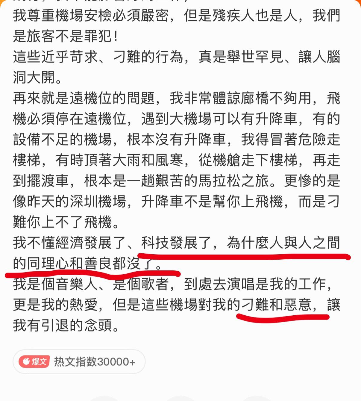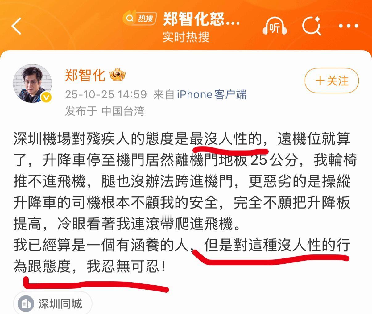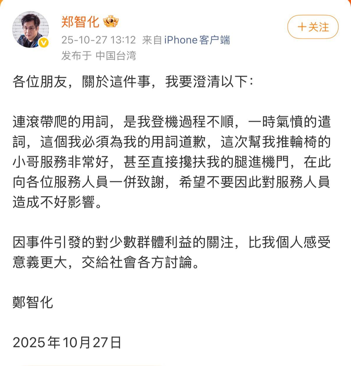 郑智化老师,你好,这声道歉该给谁? 郑智化老师,您说为用词道歉,可有些更该被看见的人,还没等到您的一句“对不起”。 先说说深圳机场那位工作人员吧。他弯腰低头搀扶您上飞机,尽心尽力的举动,被您描述成“没人性”“冷眼”,甚至让您“忍无可忍”。要不是监控还原真相,这份善意说不定会让他的工作受影响,这份委屈,您不该道个歉吗? 再想想大陆的歌迷。这么多年,您在大陆收获了名和利,歌迷的眼泪、鼓励、鲜花、掌声从没少过。可就因为机场服务的一点不周到,您就把整个环境说得毫无同理心、没有善良,甚至满是刁难和恶意,这和事实差太远了,对一直支持您的歌迷,您该说声抱歉。 还有那些关注这事的善良人。要是接受帮助后,只因一时气愤就信口开河、倒打一耙,以后谁还敢扶长者过马路?谁还敢帮残疾人?这份对善意的伤害,您也该给大家一个交代。