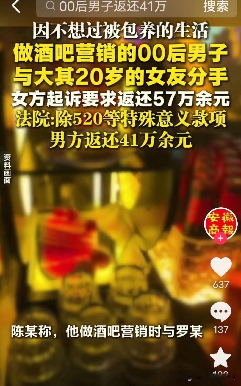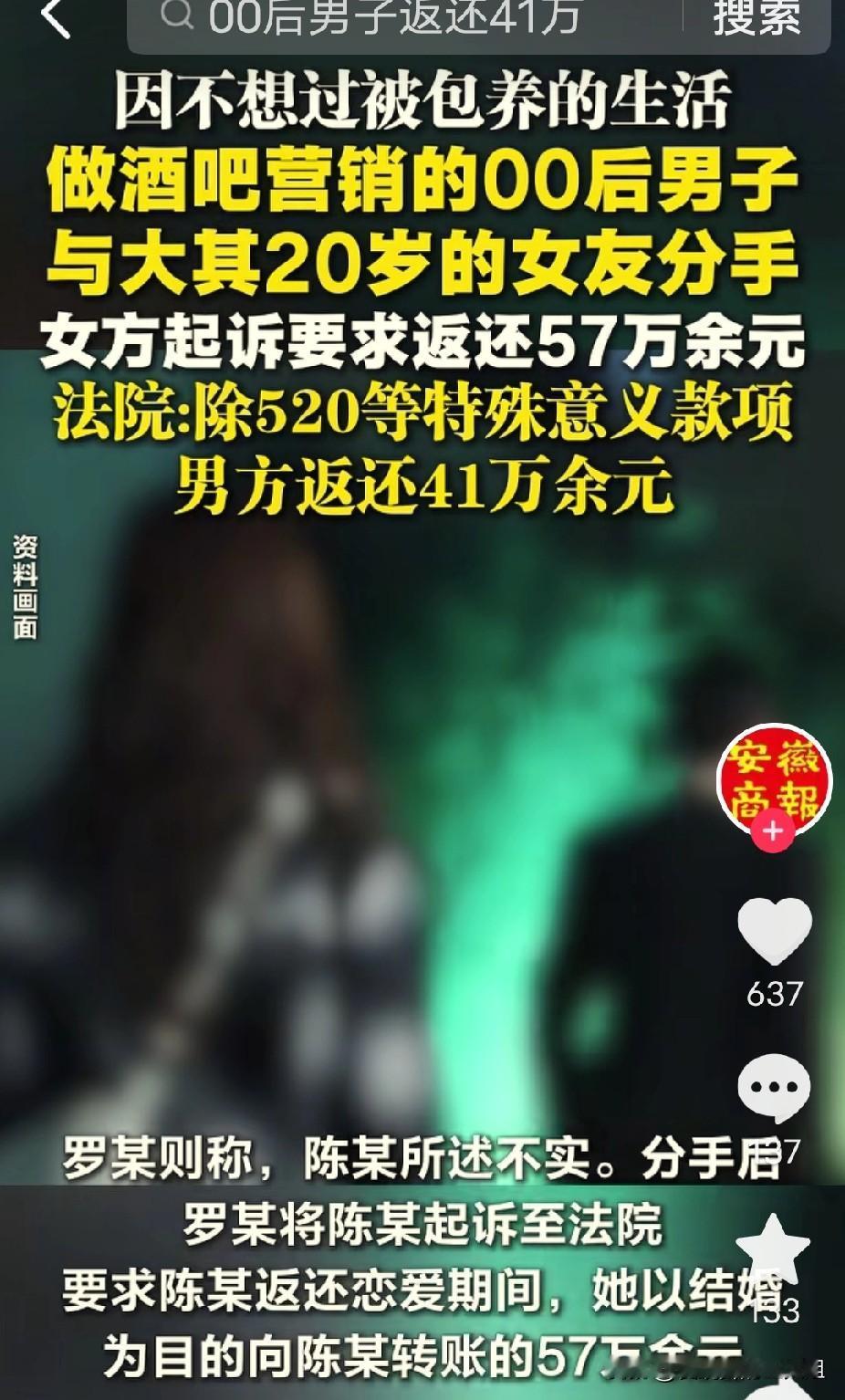 石家庄,一25岁男子在酒吧工作,与一45岁女子相识,女子看他长得英俊,立刻开始追求男子,女子给他转款57万,为了表示真诚,还给他转520,1314,俩人谈了3年姐弟恋,女子要求生个孩子,男子嫌女子年龄太大,提出分手,女子一气之下,要男子返还57万,男子拒绝,女子告到法院,男子说女子在包养他,案件经过两次审理,判决下来,男子傻眼了! 法庭上双方各执一词,男子坚称那57万是女子自愿赠予的“恋爱经费”,那些520、1314红包更是表达爱意的普通转账。女子却提供大量聊天记录证据,显示她多次提到“这些钱是给我们未来的保障”、“等你稳定下来我们就结婚生孩子”。法官仔细翻看三年间的转账记录,发现57万中最大一笔40万备注着“购房款”,其余多笔大额转账都与男子提出的“创业开店”直接相关。 法院最终认定那些520、1314的小额红包属于情感表达无需归还,但57万主款属于附条件的赠与。判决书里写得很明白:当一方基于结婚目的进行大额财物赠与时,这种赠与行为明显带有将来共同生活的预期。法官在法庭上特意强调,那笔40万购房款备注成了关键证据,“婚姻承诺下的财产转移,一旦婚约未能履行,接受财产一方应当返还”。 男子听到判决当场愣住,他原以为“恋爱期间的赠予”就像送出去的礼物要不回来,更何况两人确实相处了三年。他却没弄懂法律对“大额赠与”和“小额情感表达”的明确区分。类似案件里都有明确判决,大额财物赠与往往被视为以结婚为条件的赠与。而这位45岁的女子在法庭上坦言,她确实渴望通过孩子来巩固感情,年龄差距却让男子最终选择退缩。 感情里的金钱往来从来不是简单的数字游戏,那些带着承诺的转账更像是一份信用凭证。当男子收下57万时,他实际上也接住了对方对“共同未来”的期待。法官在宣判时特意提醒恋爱中的男女,保持财务清晰度才是对感情的真正保护。那些以为用青春就能兑换财富的人,最终会发现法律的天平始终倾向于公平正义。 各位读者你们怎么看?欢迎在评论区讨论。