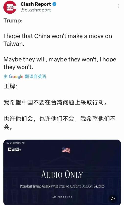 特朗普一声叹息! 中美吉隆坡谈判期间,特朗普发文称:“我希望中国不要在台湾问题上采取行动。也许他们会,也许他们不会,我希望他们不会。” 这是日薄西山的美帝,无可奈何的悲鸣!台湾问题是中国内政,任何势力无权指手画脚! 我希望美国不要插手世界任何一场战争,你们或许会,或许不会,但是我希望你们不会。因为只要你们参与就会天下大乱,永不太平。 两岸话题目前是漂亮国唯一可以拿出来要挟我们的,这红线一碰,一盘散沙的西方立即会聚起来,老特这番话是故意的!特朗普奉劝你少点希望。看你们那些跑到大中华地面上刷存在感的人,早晚把你们收拾了!让你们一一消灭在这无尽的海洋里! 台湾自古以来就是中国无可辩驳的领土!台湾问题纯属中国内政,任何人和任何势力绝无可能干涉或者阻碍中国统一,台湾当归!一旦台湾回归,那些想蚕食拿捏中国的梦,都会犹如皮球泄气一般,吱一声瘫扁地下!