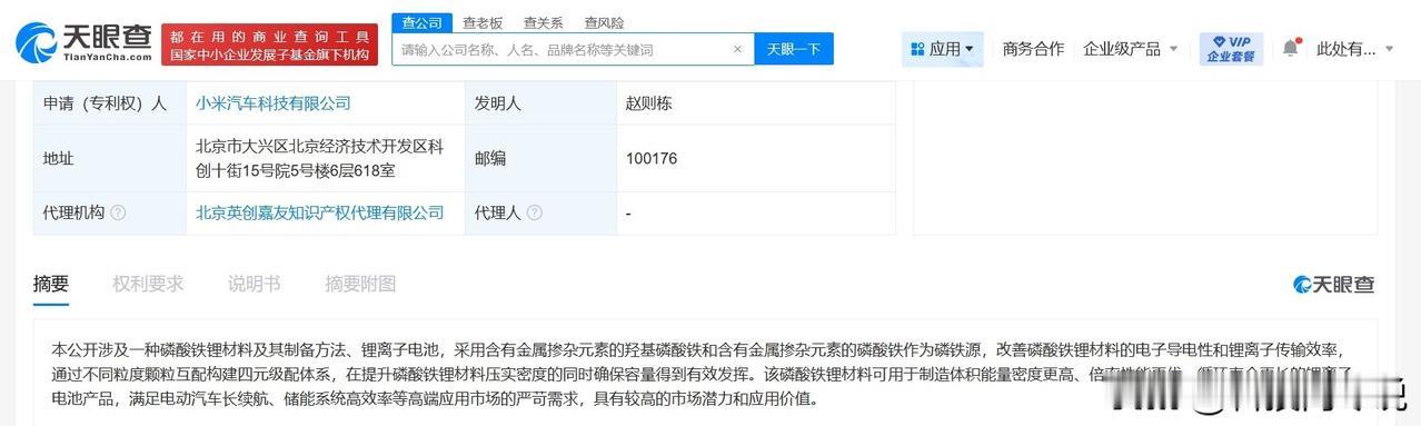 【小米汽车公布磷酸铁锂材料制备专利 可用于制造体积能量密度更高的电池产品】 天眼查App显示,近日,小米汽车科技有限公司申请的“磷酸铁锂材料及其制备方法、锂离子电池”专利公布。 摘要显示,本公开采用含有金属掺杂元素的羟基磷酸铁和含有金属掺杂元素的磷酸铁作为磷铁源,改善磷酸铁锂材料的电子导电性和锂离子传输效率,通过不同粒度颗粒互配构建四元级配体系,在提升磷酸铁锂材料压实密度的同时确保容量得到有效发挥。该磷酸铁锂材料可用于制造体积能量密度更高、倍率性能更优、循环寿命更长的锂离子电池产品,满足电动汽车长续航、储能系统高效率等高端应用市场的严苛需求,具有较高的市场潜力和应用价值。 天眼查信息: