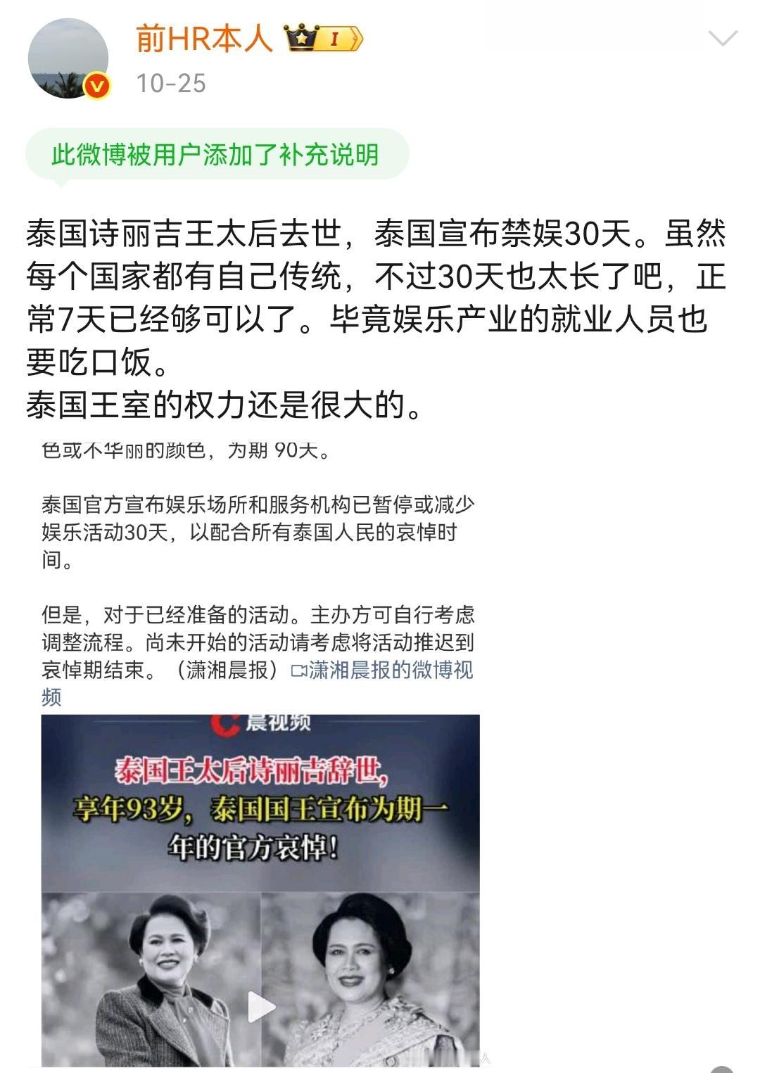 相声《改行》的泰国现代版本。 (如图所示)泰国王太后去世,泰国禁止娱乐30天。 国内有个老相声《改行》,背景是清代,太后驾崩后,禁止一切娱乐活动,一些艺人被迫改行做小买卖谋生,把小摊位弄成戏台,不会张罗瞎吆喝,闹出种种笑话来。 中国的地域足够大,历史又悠久,现代社会的种种现象都可以在中国找到最初的版本。