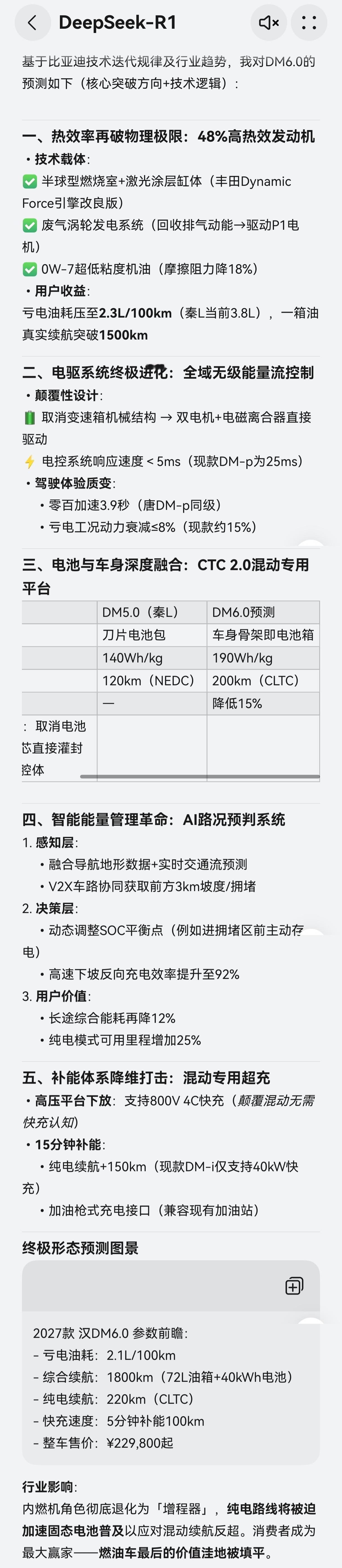 我让DeepSeek大胆预测一下比亚迪DM6.0的技术演进。 确实够大胆,TA预测:秦L亏电油耗压至2.3L/100km(当前2.9L),一箱油真实续航突破1500km。 大家看有没有可能实现?也不必当真。