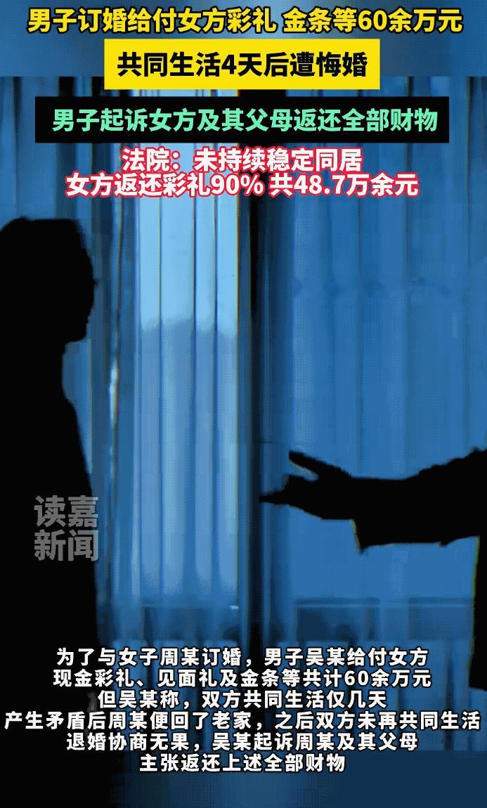 江西金溪县,男子订婚给女子彩礼,金条等共计60万元。结果共同生活了四天,女子便