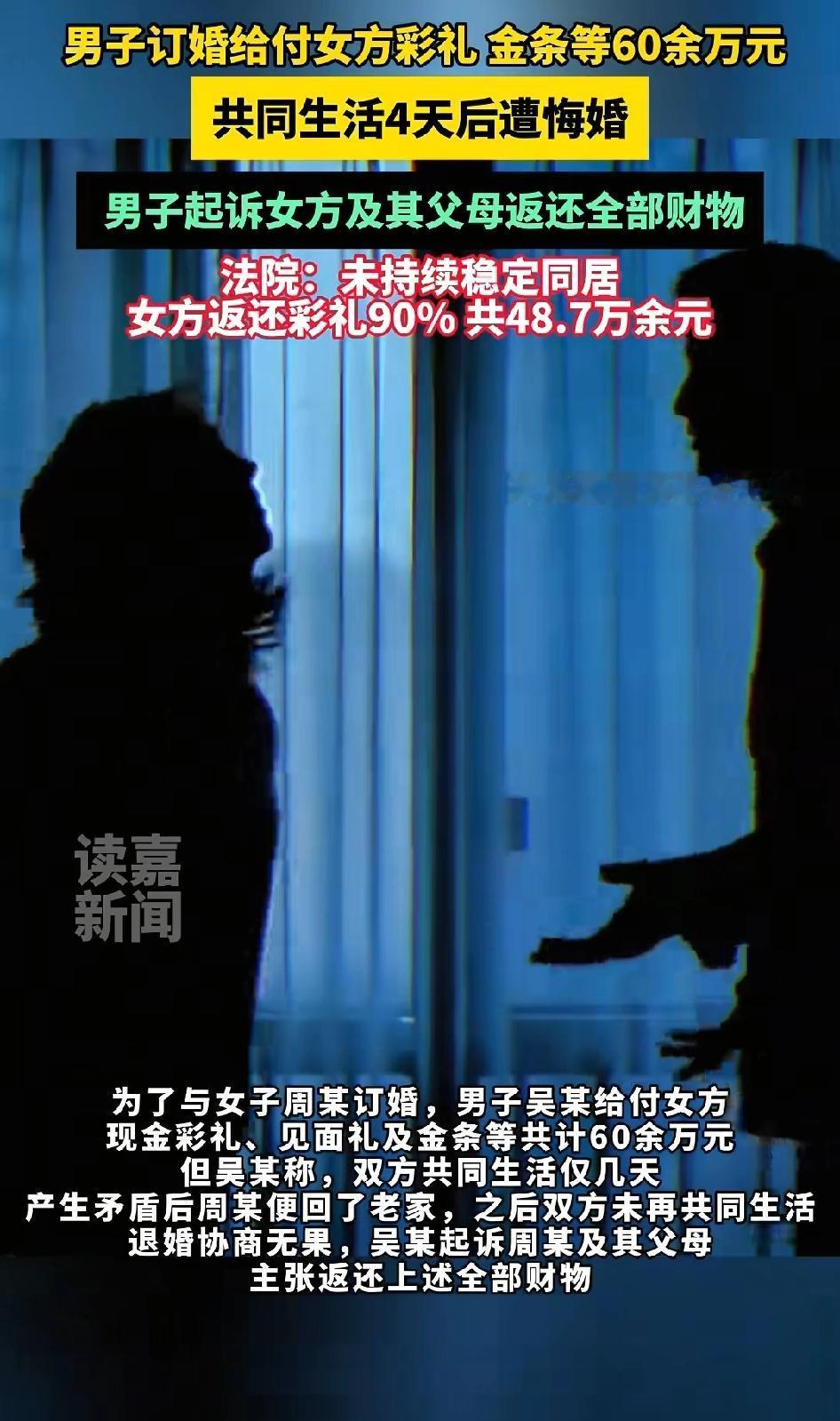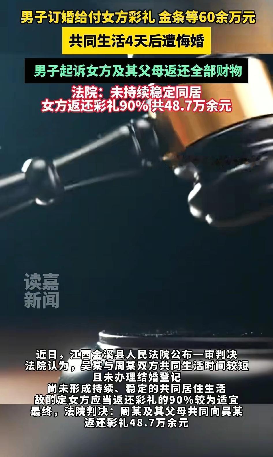 江西金溪县,男子订婚给女子彩礼,金条等共计60万元 。结果共同生活了四天,女子便悔婚了 。 共同生活了几天 ,因矛盾,女方回了娘家之后就没有再共同生活 。退婚协商无果,男子将女子告上法庭,要求退还全部彩礼。 法院判了,未持续稳定同居,判女方退还彩礼90% ,共48.7万元。 网友热议 ,这样也不应该,下次又要别人的60万,过几天又分了,又得10多万,应该是全部退还。 不得不说,这个女子真的是了不得呀!明摆着就不是去过日子的,反而是讹了人家这么多的钱 。结婚了两个人 共同维护家庭和睦 ,有事商量,不要闹到最后,不欢而散 。 对此你有什么看法 ?