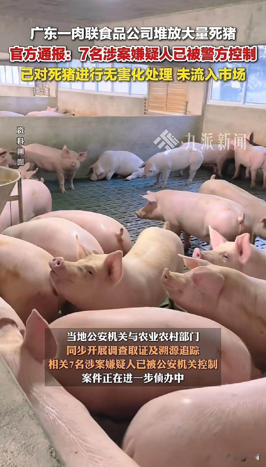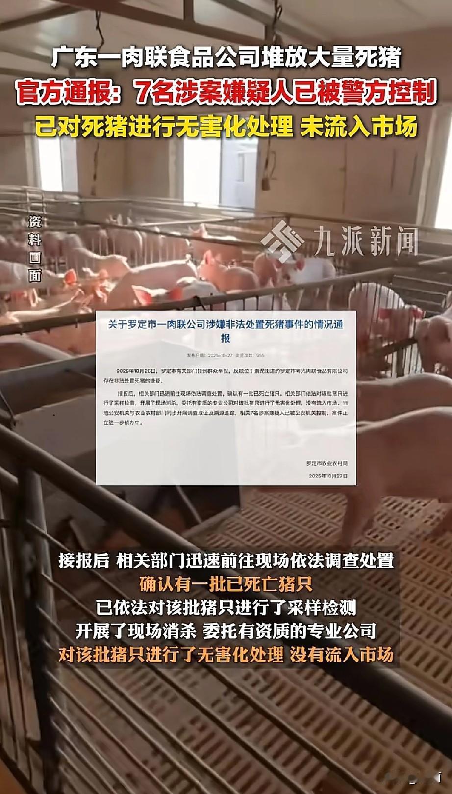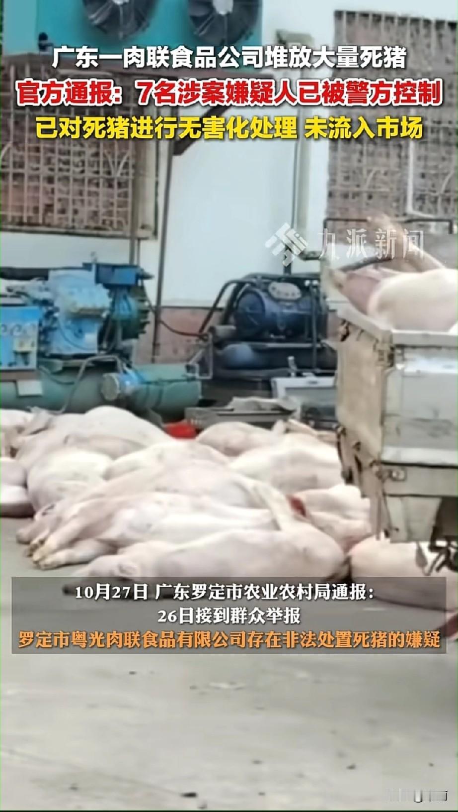 网友爆料广东罗定粤光肉联公司露天堆大量死猪,门口、内部还有运输车上都堆着,看着吓人,疑似要加工 。 10月26日有人举报后,部门立马去查,清点出超200头死猪。现在这些死猪已经采样检测、消杀,还做了无害化处理,没流进市场,7个涉案的被公安控制了,正追来源 。 按规定,病死或死因不明的畜禽必须妥善处理,不能随便堆、不能加工。这些死猪可能带病菌毒素,吃了会中毒甚至危及生命 。 还好发现及时没流到餐桌,这种赚黑心钱的就该重罚。食品安全不是小事,得盯紧点,不然太让人担心了。
