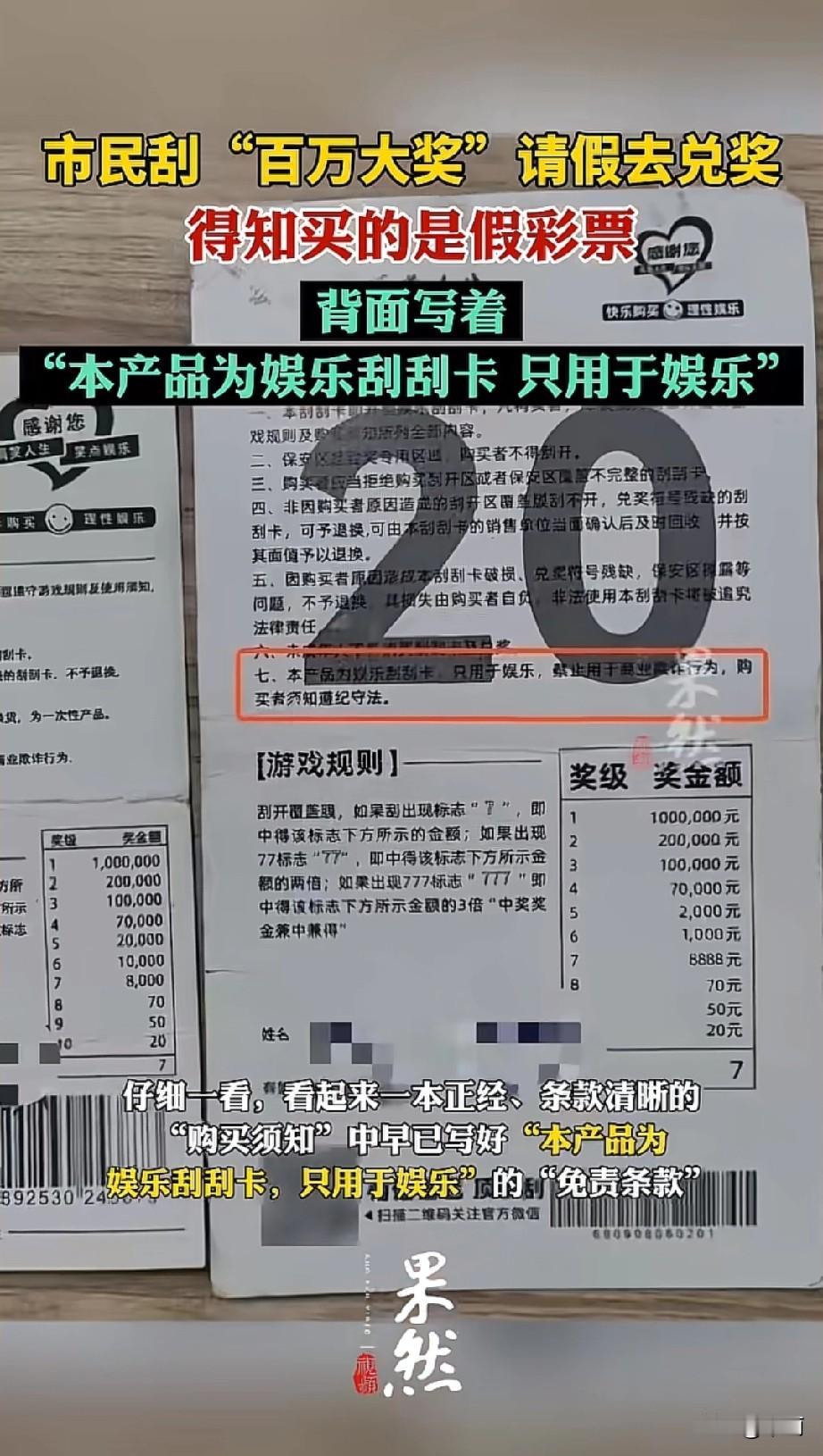 苏州有市民在地铁站流动摊贩那买了两张“大7”即开票,刮出100万大奖,特意请假去体彩中心兑奖,结果被工作人员识破是假的,票上藏着“仅用于娱乐”的字。 这种假彩票是网上卖的整蛊道具,一块多到四块钱一张,印着几十万甚至百万“奖金”,最近青海、内蒙古等地也有人拿着去兑奖 。 正规彩票有“顶呱刮”标识、防伪底纹,票背还有发行机构信息,假的一摸一看就不对 。 流动摊贩和网上商家太缺德,利用人想中奖的心理坑人。购彩必须去挂代销证的正规体彩店,别贪方便吃大亏。 拿假彩票兑奖可能违反法律,商家卖这个也该管管,不然市场秩序都被搅乱了 。