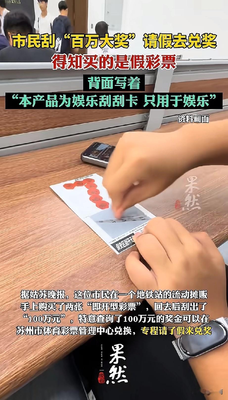 苏州有市民在地铁站流动摊贩那买了两张“大7”即开票,刮出100万大奖,特意请假去