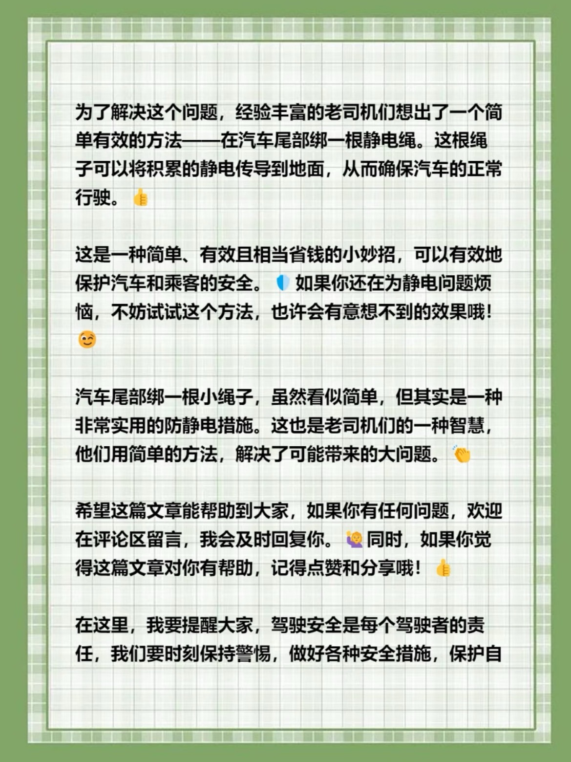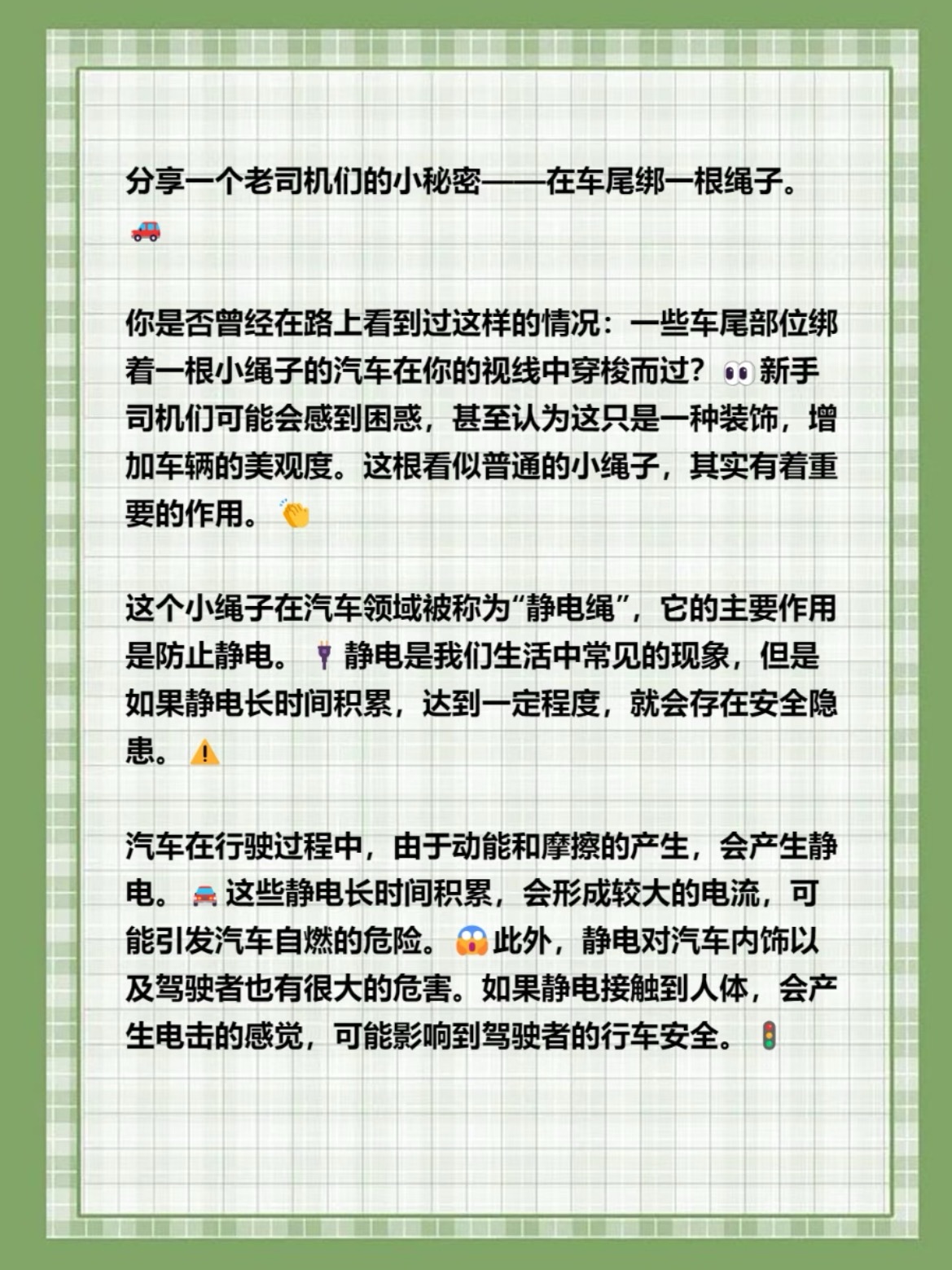 为了解决这个问题,经验丰富的老司机们想出了一个简单有效的方法——在汽车尾部绑一根静电绳。这根绳子可以将积累的静电传导到地面,从而确保汽车的正常行驶。👍
