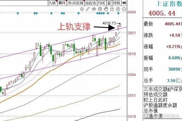 下图当中我们可以看到上证指数近期突破上升通道上轨之后,理论上来说进入到短线的加速阶段。也就是说这个位置是不宜看空的。即使调整,也会有通道上轨的支撑。而且还有一点,即使调整的稍微深一点,也会有昨天跳空缺口的支撑。