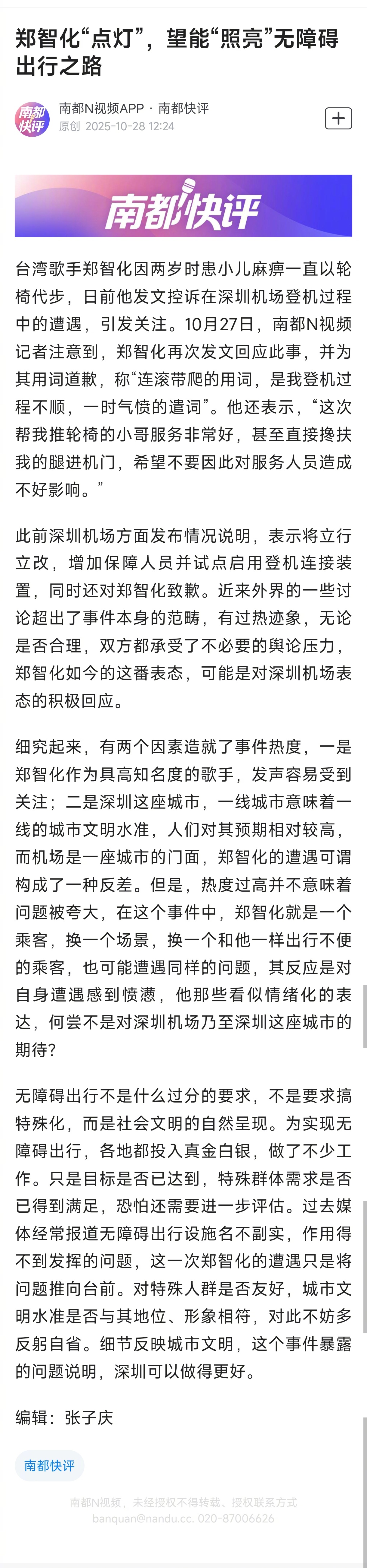#郑智化点灯望能照亮无障碍出行之路#【南都快评:郑智化“点灯”,望能“照亮”无障碍出行之路】#无障碍出行不是什么过分的要求#台湾歌手郑智化因两岁时患小儿麻痹一直以轮椅代步,日前他发文控诉在深圳机场登机过程中的遭遇,引发关注。10月27日,南都N视频记者注意到,郑智化再次发文回应此事,并为其用词道歉,称“连滚带爬的用词,是我登机过程不顺,一时气愤的遣词”。他还表示,“这次帮我推轮椅的小哥服务非常好,甚至直接搀扶我的腿进机门,希望不要因此对服务人员造成不好影响。”