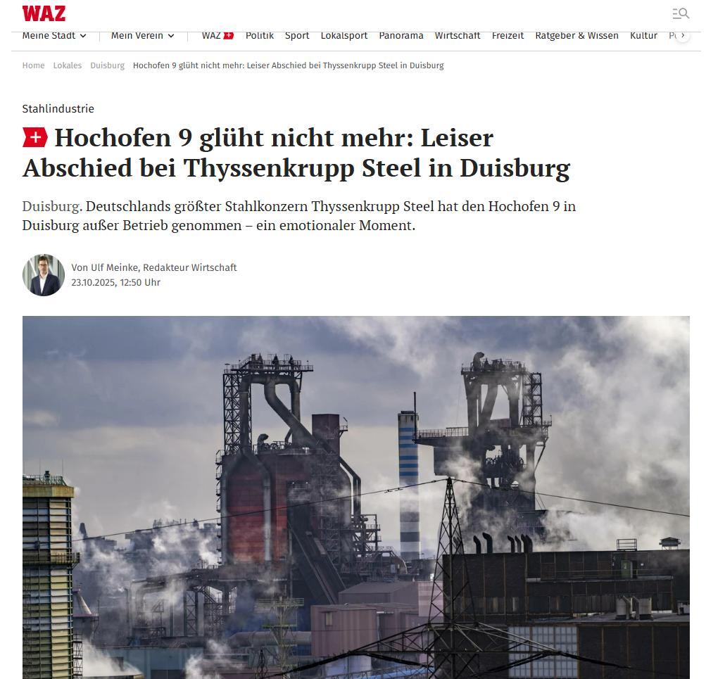 哦豁,连德国最老牌的钢铁厂都开始关闭熔炉,静静地告别钢铁时代! - 蒂森克虏伯,德国这家最著名的钢铁企业,已经宣布关闭9号高炉。 - 杜伊斯堡的工厂最后一次出钢,标志着一段德国工业历史的终结。 - 几十年来,这座高炉一直是鲁尔区工业实力的象征。如今,它已停产。 - 该公司正面临能源成本、二氧化碳排放目标以及全球市场疲软的三重压力。 德国人全在感叹:游戏结束!一个时代就这么过去了,德国却还在想着什么【重新武装起来】。