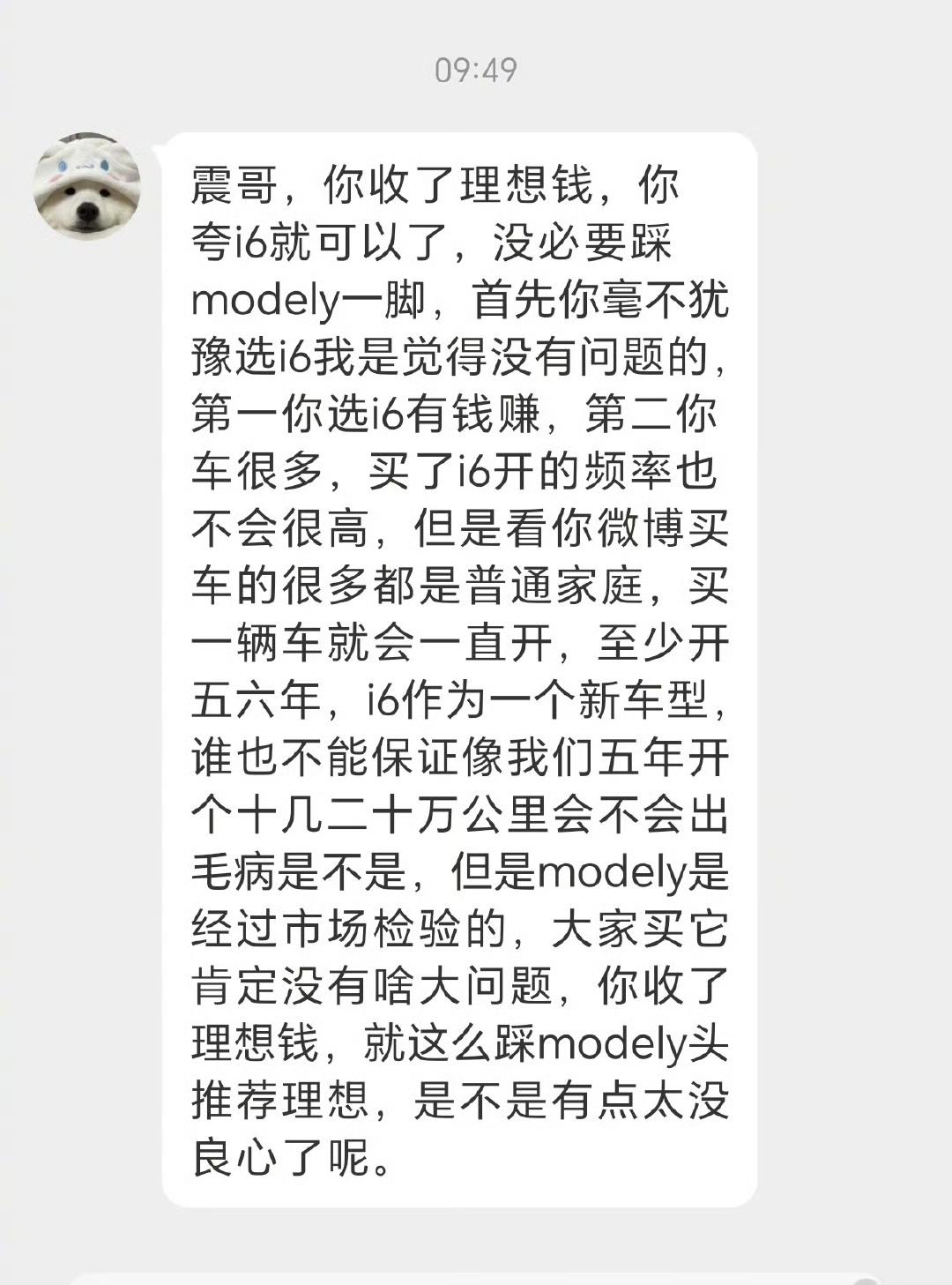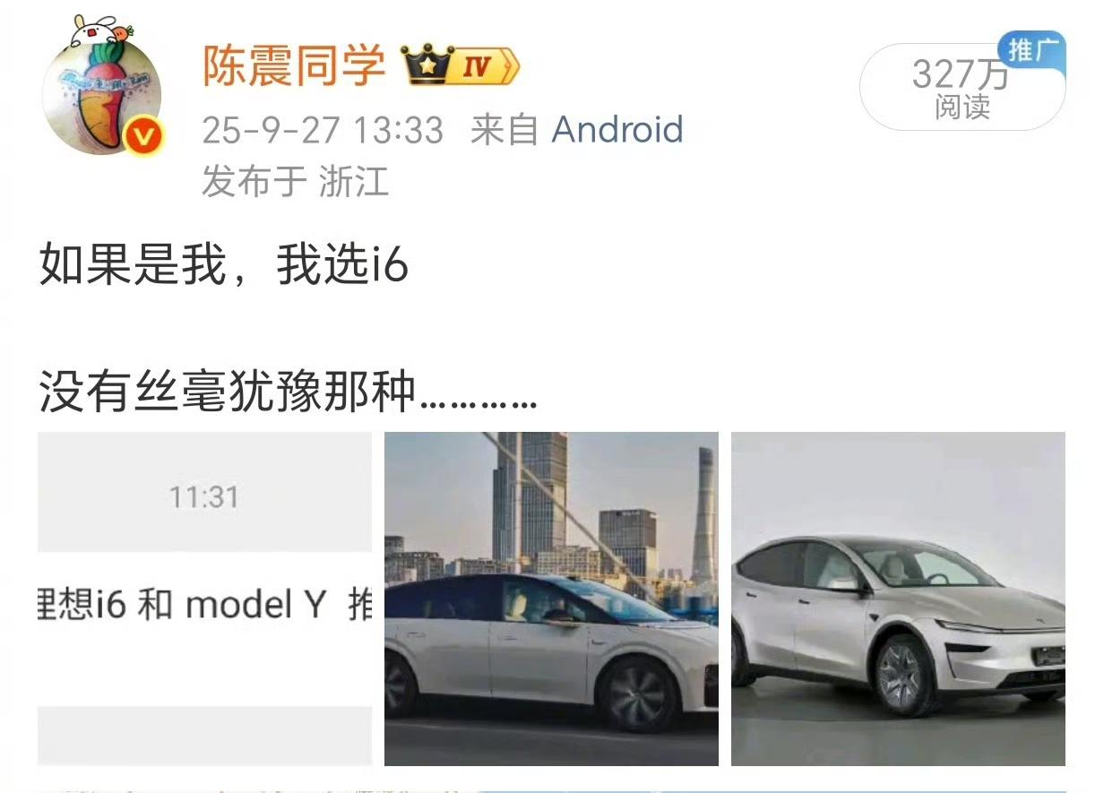 陈震:我什么时候踩ModelY了?我很明确的说买ModelY没问题,追星马一龙也没问题,这难道还不行吗? 你张嘴闭嘴普通家庭,普通家庭难道不是更需要一个底盘更舒服、静谧性更好、空间更大、配置更高、辅助驾驶更好的车吗? 如果是普通家庭用车的话,买车更需要慎之又慎,但是也没有必要死盯着一个品牌,因为每一家的情况是不同的,大家可以根据自己的需求来购车,别人的意见只能是参考,当然社会也允许其他意见。 特斯拉能卖出这么多车,还是大多数人认可这个品牌,这也没有什么不好的,而且特斯拉的车二手车也相对来说比较好卖。 各位是怎么看的?欢迎评论区留言。