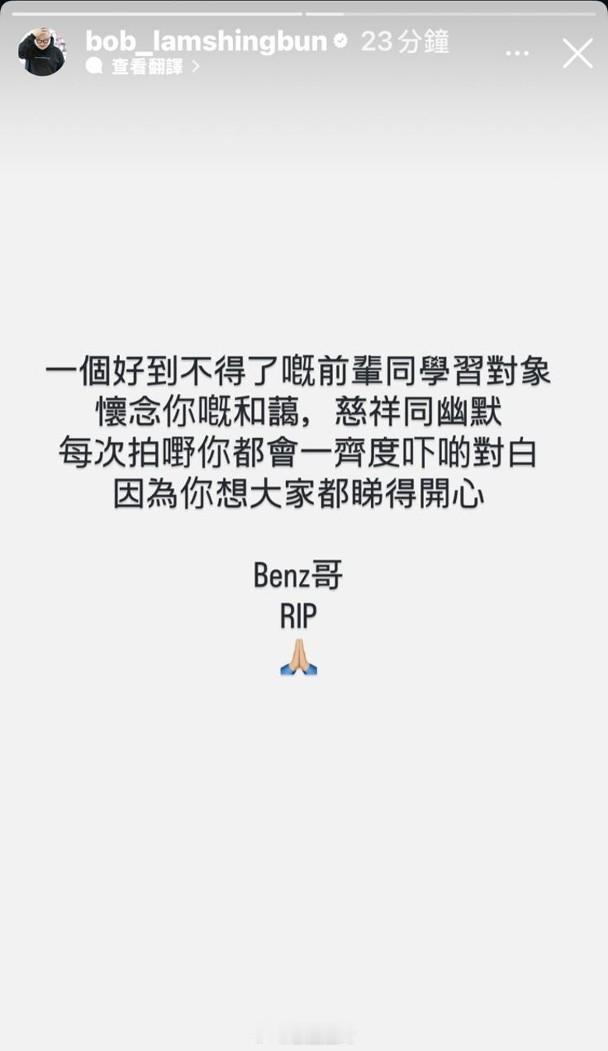 林盛斌:「一個好到不得了的前輩和學習對象懷念你的和藹,慈祥和幽默每次拍東西你都會一起度一下對白因為你想大家都看的開心 Benz哥 安息吧」